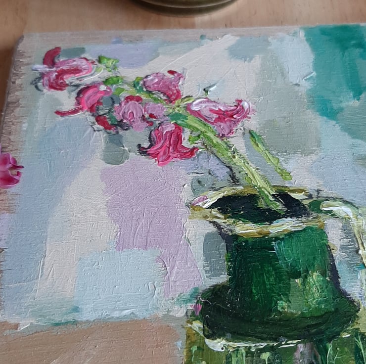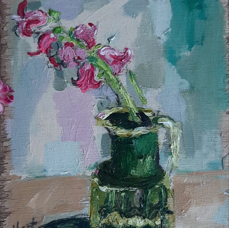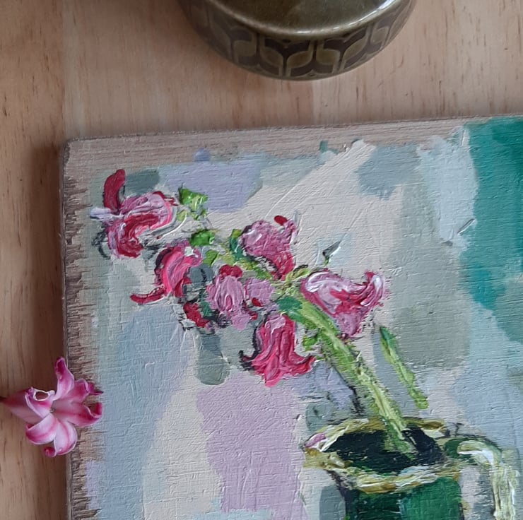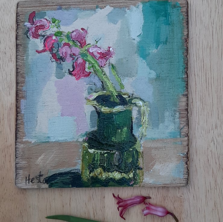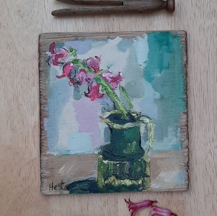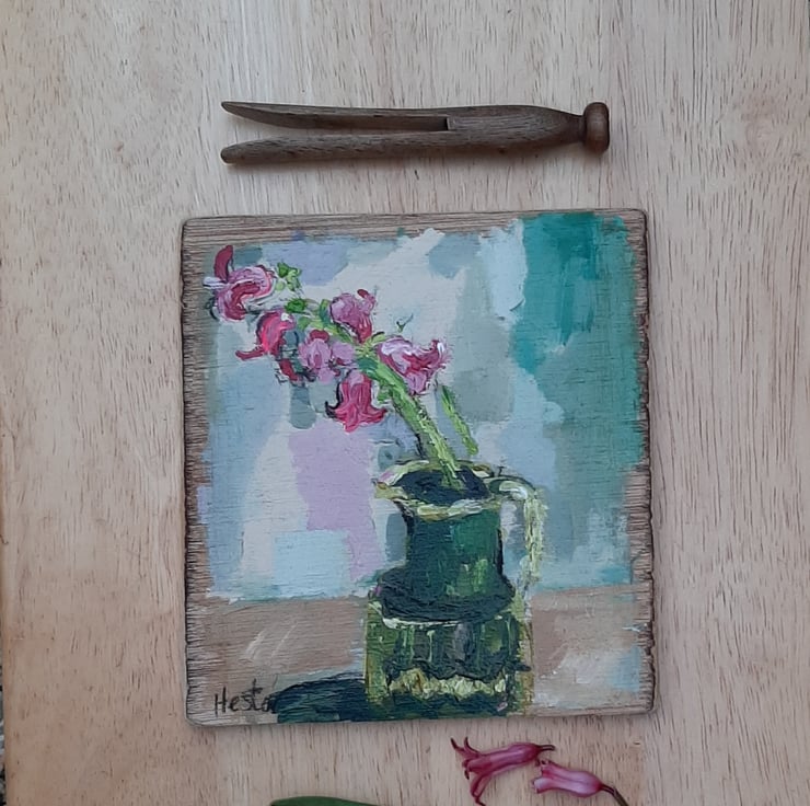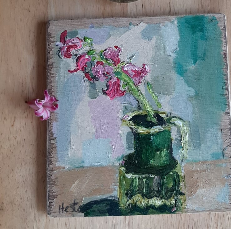 A modern, contemporary and rustic still life by artist hestasinglewood aka bodkincreates on Instagram. Painted on reclaimed wood kept intentionally rustic at the edges. Sanded,varnished, signed and ready to hang .measuring 16 cm tall and 15cm.wide full of texture and confidently painted. Singing of the joy of spring hyacinths.