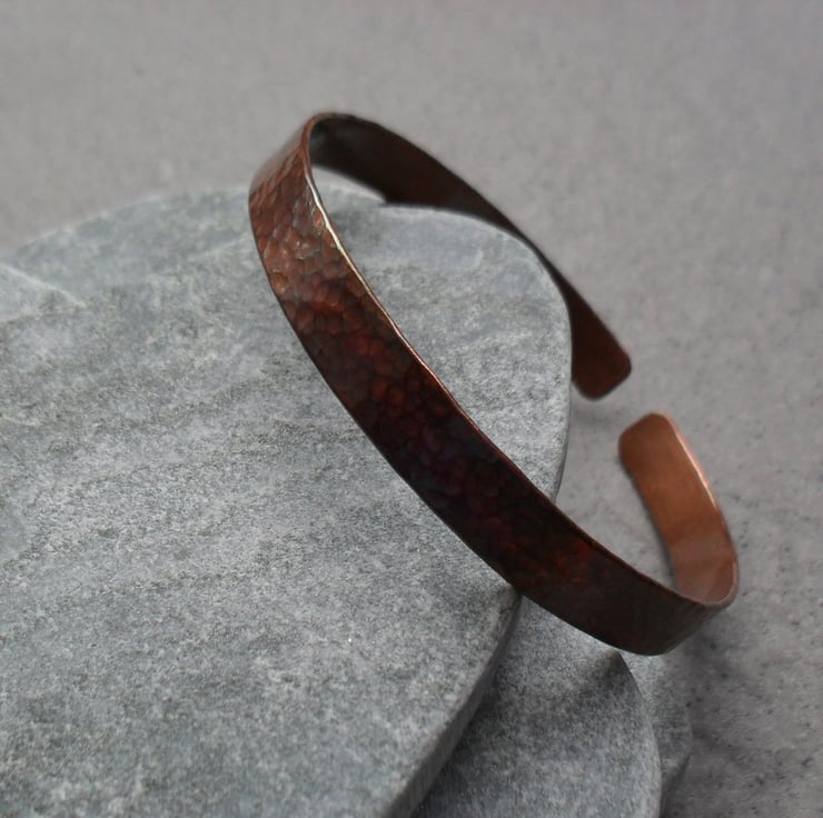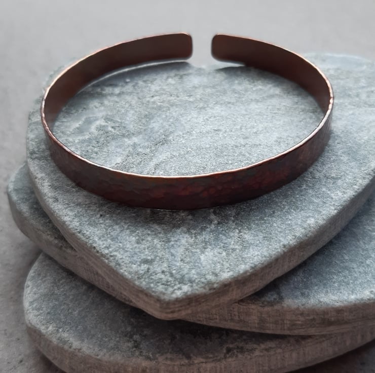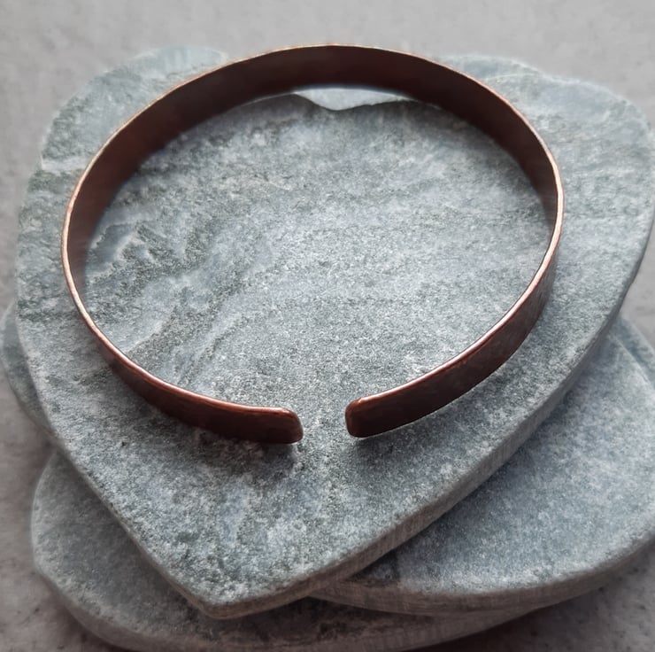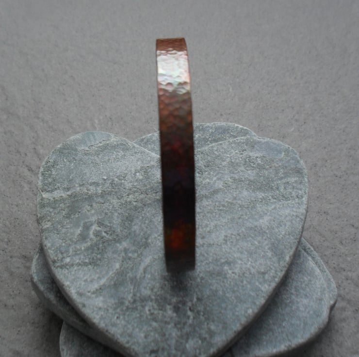 Copper bangle made out of 1 mm thick copper which has been hammered to give texture, sanded and oxidised to give an aged look