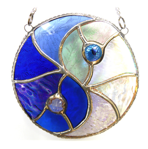 This is a stained glass suncatcher made using the Tiffany copper foil technique.