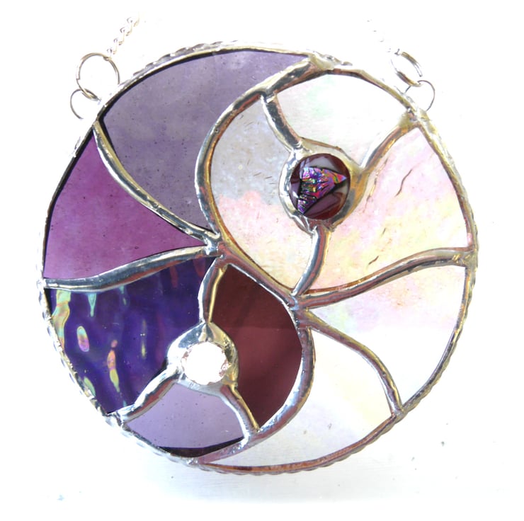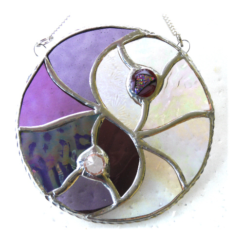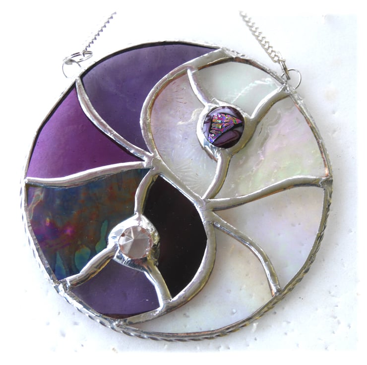 One half is made from 5 types of bright purple glass and the other from 5 types of clear iridescent glass mostly with a purple tinge. Although the beauty of this symbol is in its simplicity I've used artistic licence and added movement with different textures and shades.