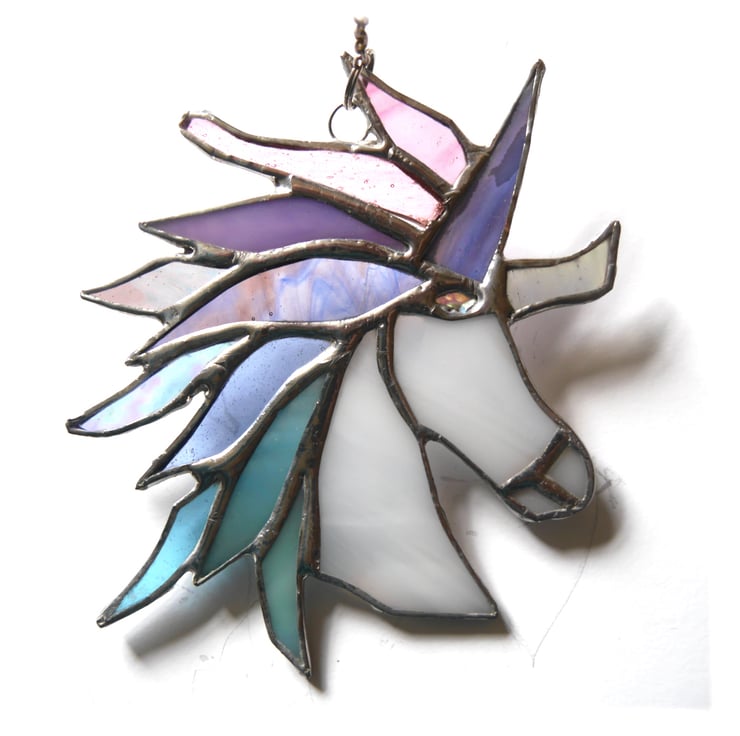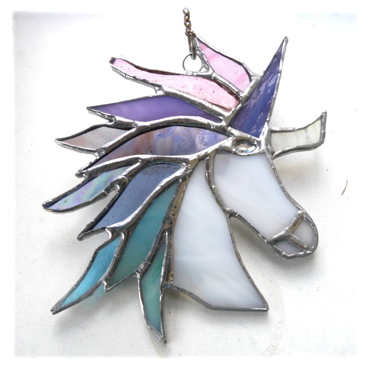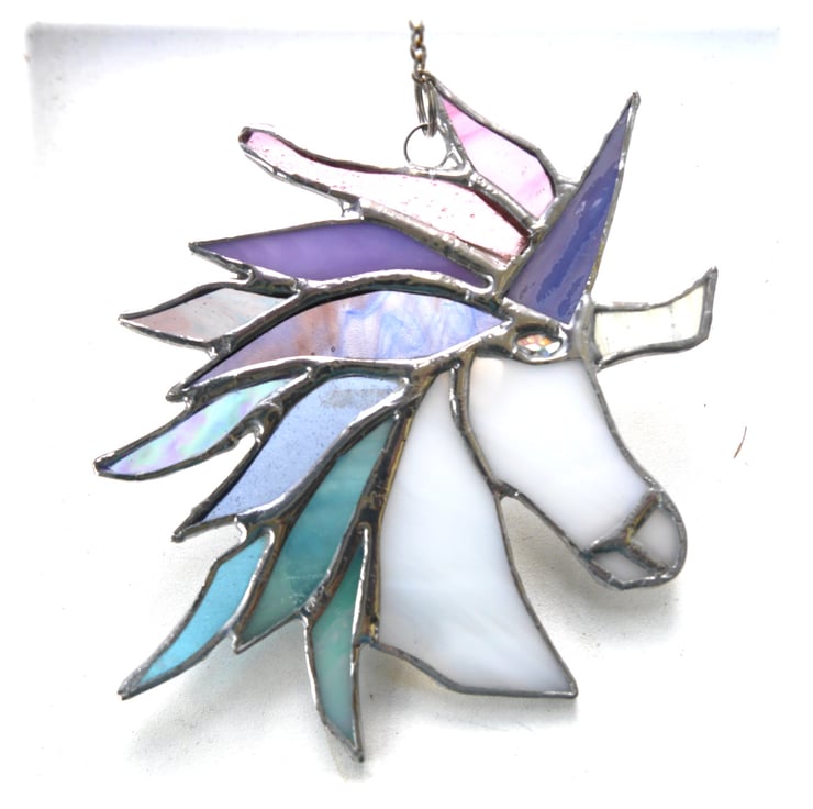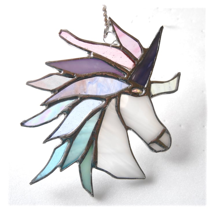 The unicorn hangs from a silver chain which is securely attached to the top by a soldered wire ring.