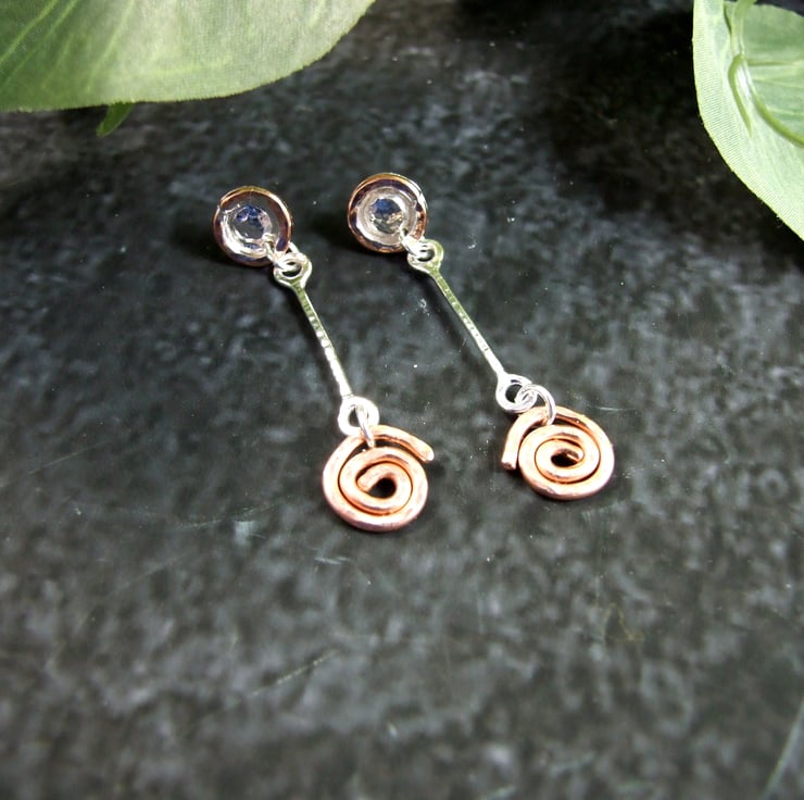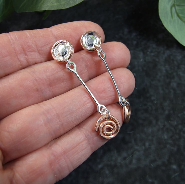 Spiral Earrings, Sterling Silver and Copper Dangle Studs.