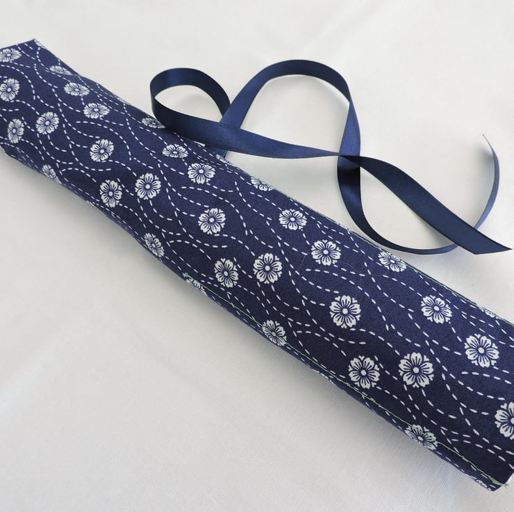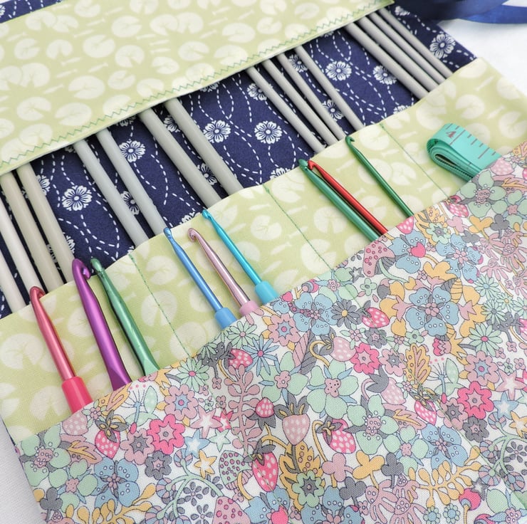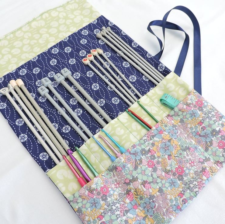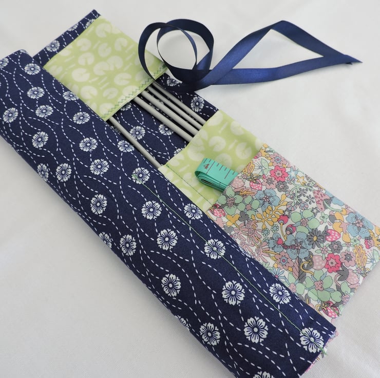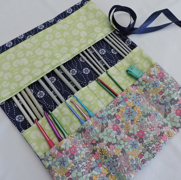 This knitting needle and crochet hook roll has been made with cotton fabrics. The outer and inner of the roll is a navy blue and white floral fabric with a pale green header. It has two layers of cotton fabric pockets with four divisions in each layer one in the same pale green fabric as the header of the roll, and the other is a pretty floral fabric in pink, green, blue, yellow, grey and white.. The divisions are large enough to hold a number of needles, crochet hooks, scissors, tape measures etc.