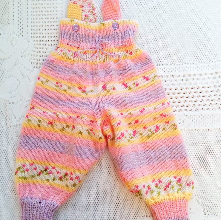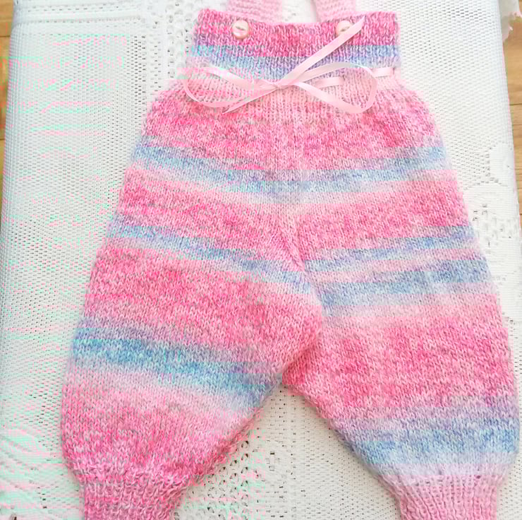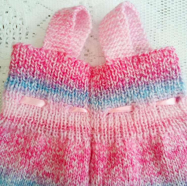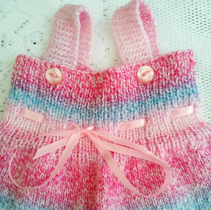 These all in one dungarees for baby are hand knitted in a double knitting yarn. They have two straps to keep them up and a ribbon tie at the waist. They would make an ideal Christening gift, new baby gift or baby shower gift and will suit either a boy or girl.