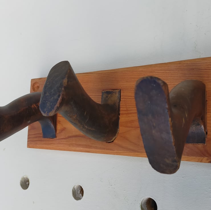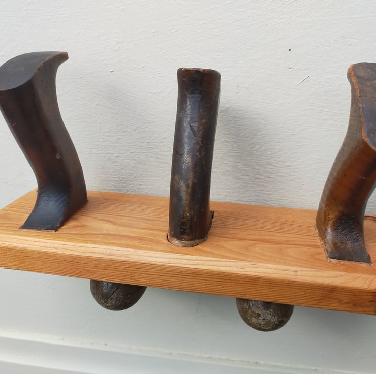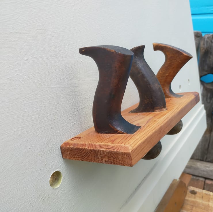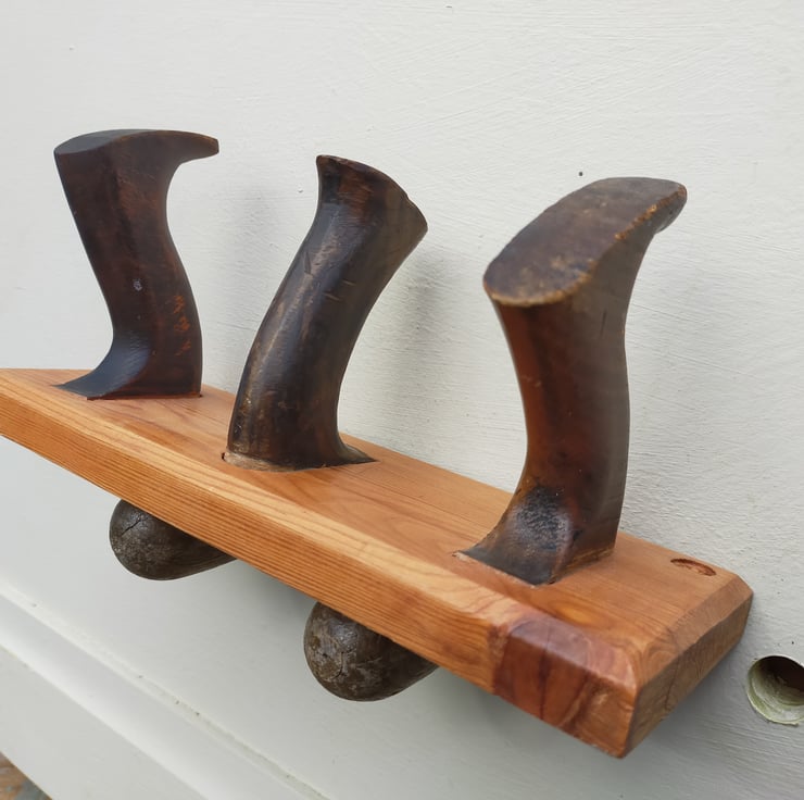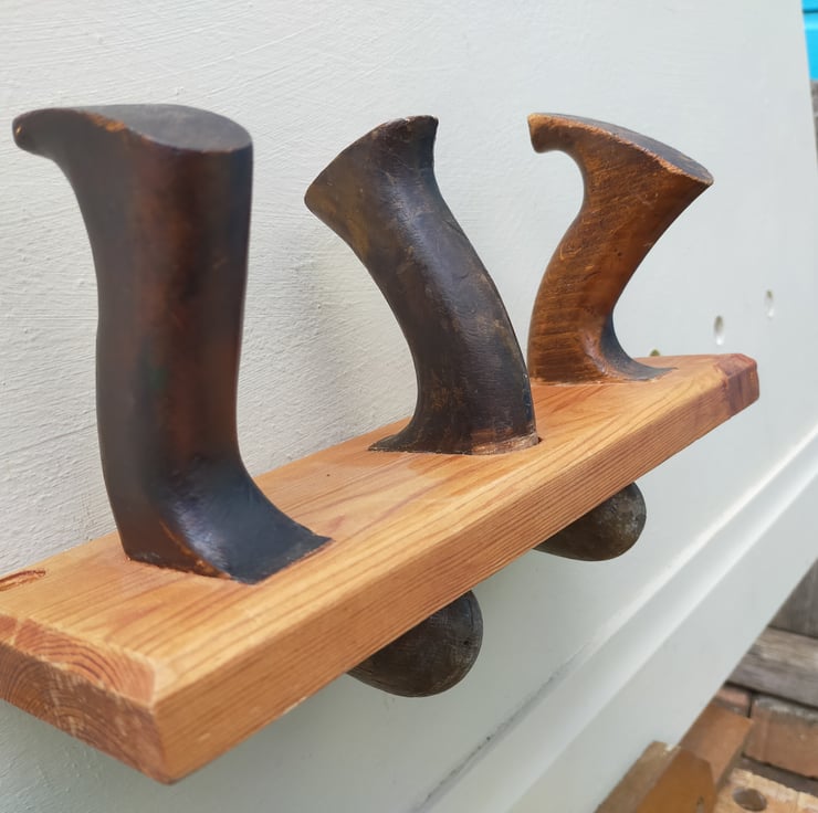 Absolutely unique set of three vintage beech plane handles, each showing the wear of many years' use, embedded in pitch pine, suitable for towels or dressing gowns. Two countersunk screw holes allow it to be mounted on the narrowest of door rails. Waxed finish, L 290mm x H 100mm x D 135mm.