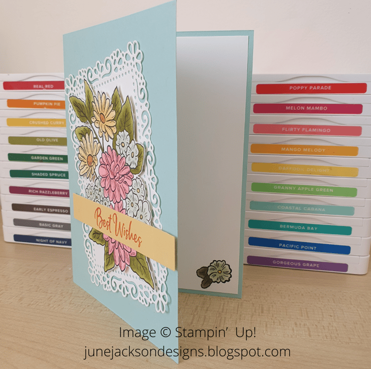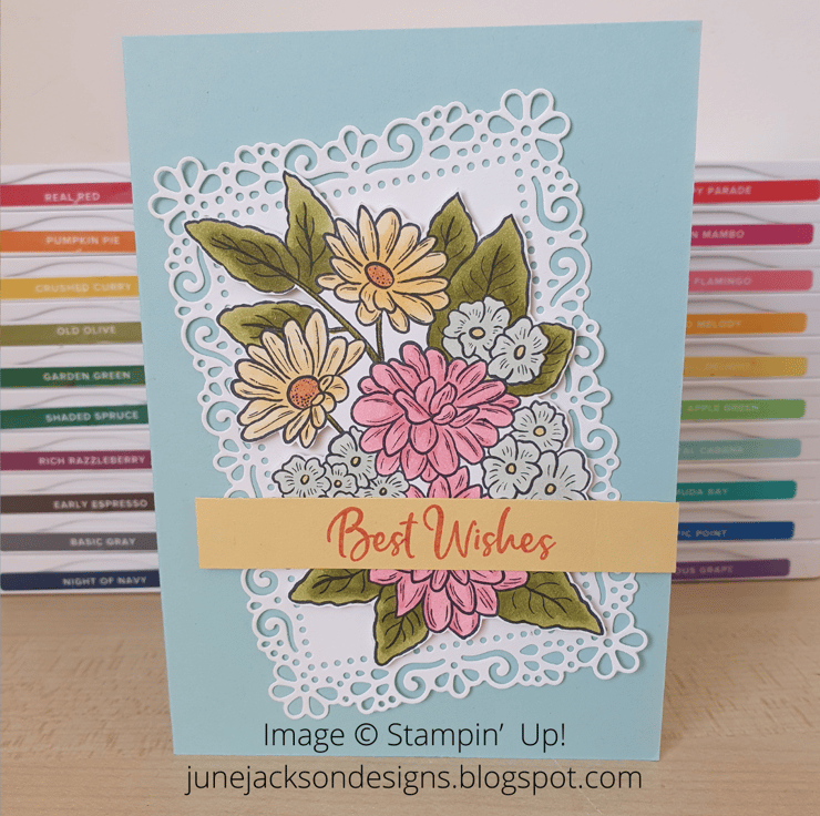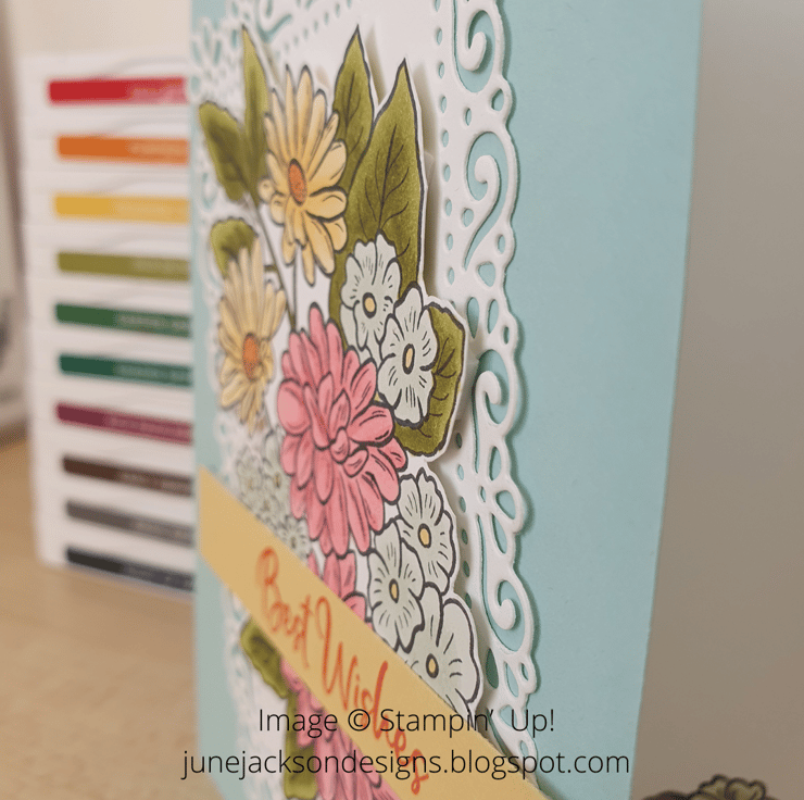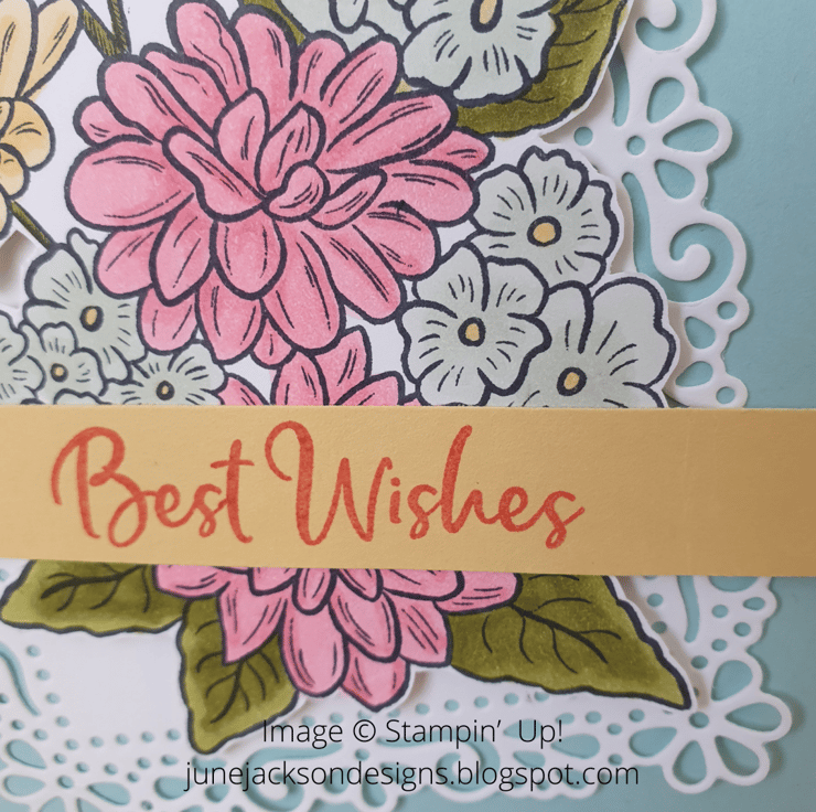 A Stampin Up floral best wishes card has been hand stamped and coloured using a selection of alcohol markers layered over an ornate white die cut.