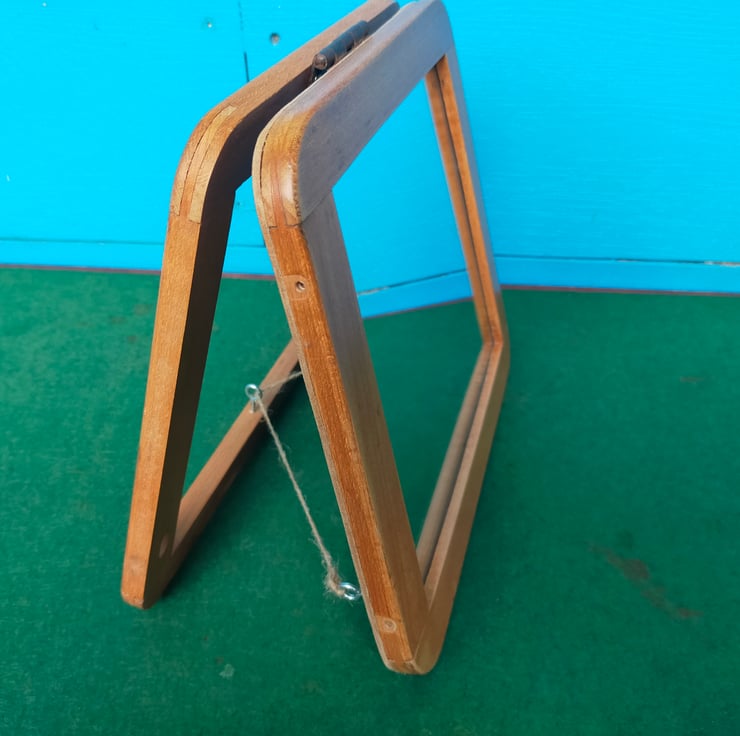 This vintage Dunlop-style of tennis racket press has been adapted to work as a wall mirror or a hinged free-standing mirror for a dressing table. The mirror has been rebated into the front frame and then backed with hardboard, and I have hinged the top to create an A-frame. The angle of stand can be altered by shortening the cunning arrangement of screw-in eyes and hairy string at the back. An excellent gift for a vintage tennis player! Waxed finish, L 230mm x L 250mm x D up to 160mm.