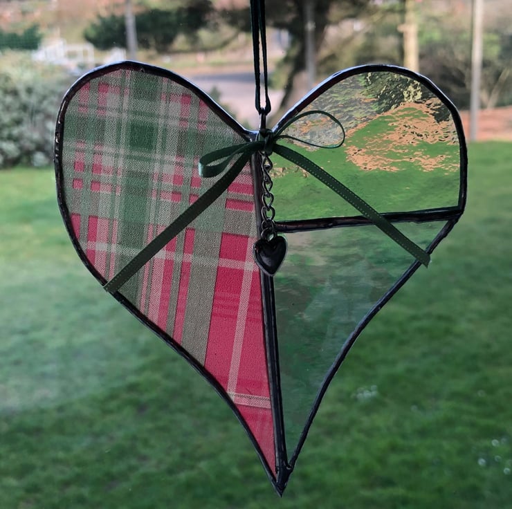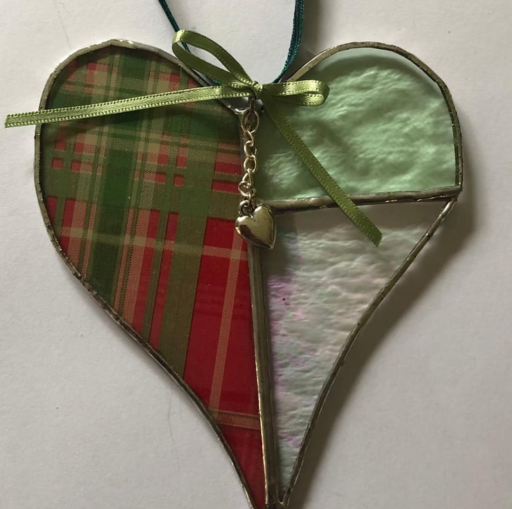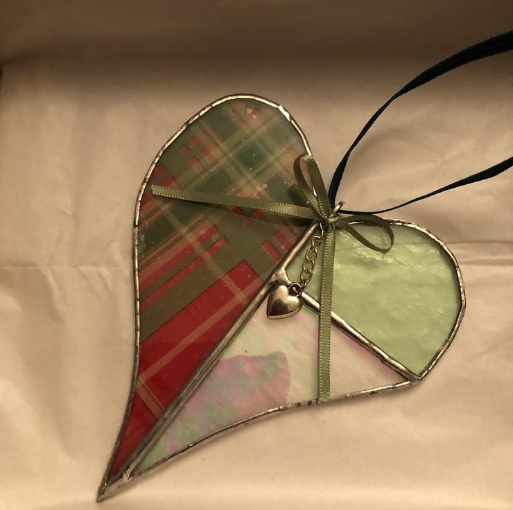 Handmade stained glass Heart using Tiffany style copper foil and solder, one half has tartan tissue paper on the back and the other half is in two pieces with the top pale green and the bottom clear iridescent glass. The piece is finished in silver solder with a silver effect heart and a green bow hanging from tartan ribbon. Size 11cm width, 14cm length.