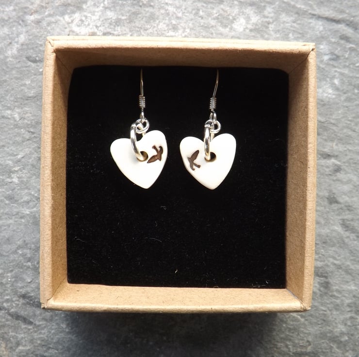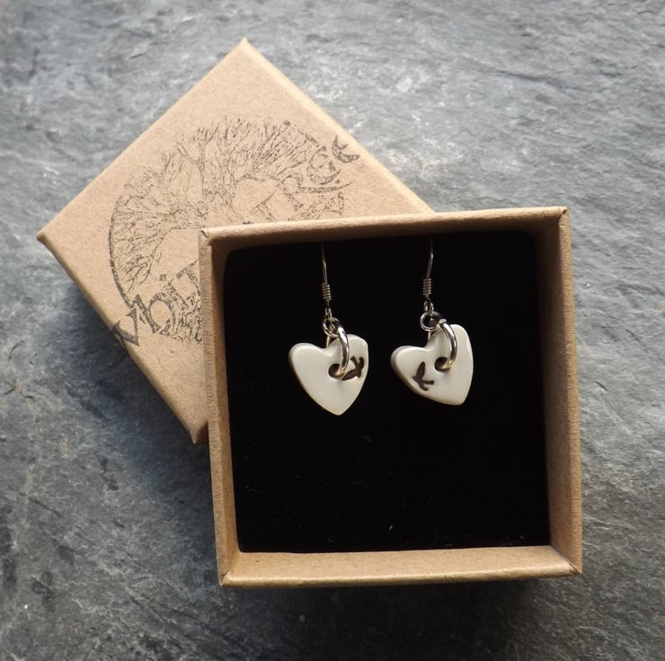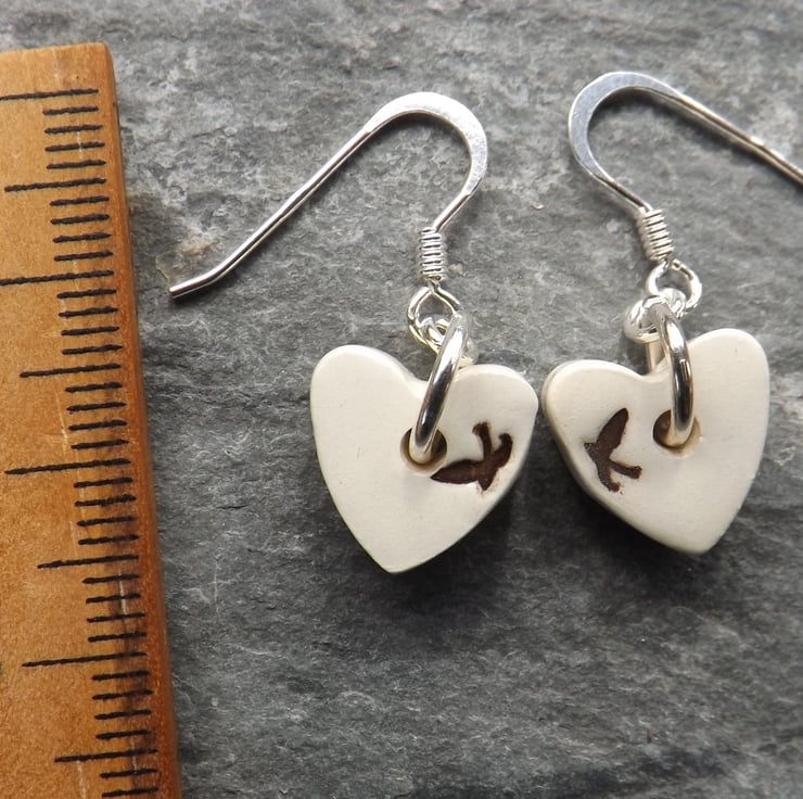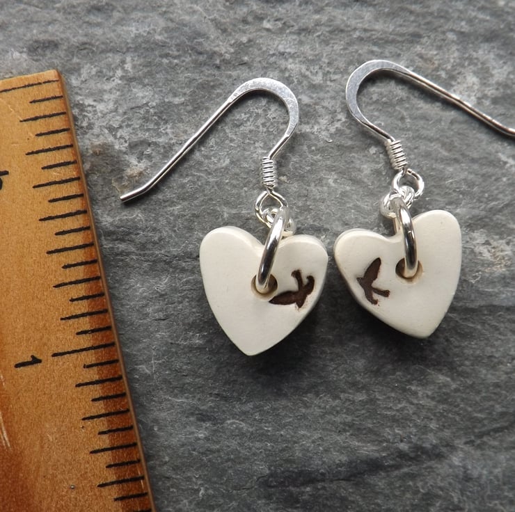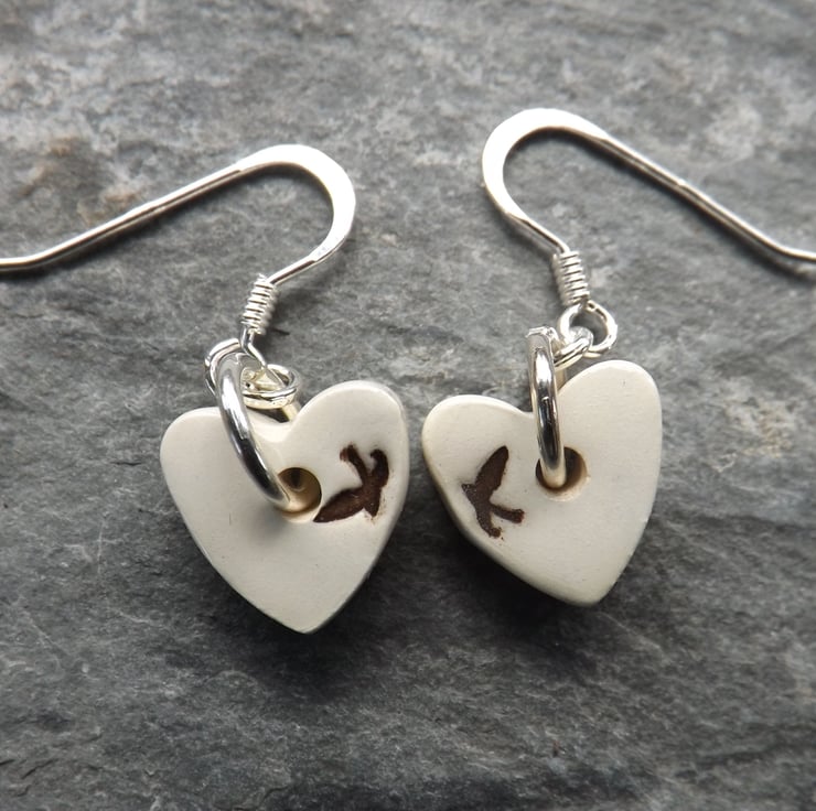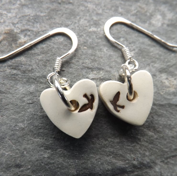 Handmade ceramic and sterling silver heart shaped swallows drop earrings