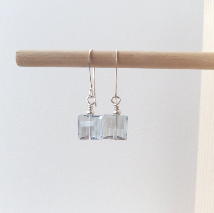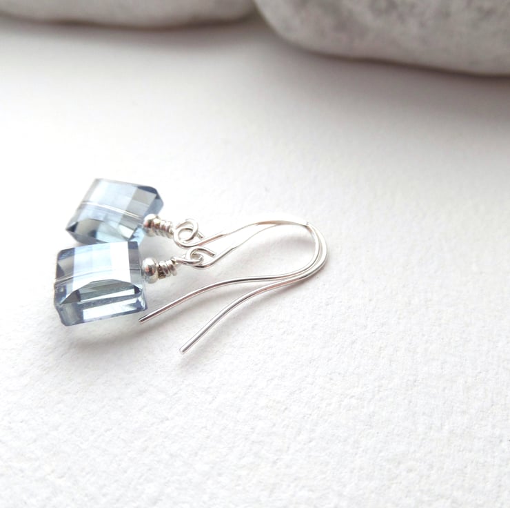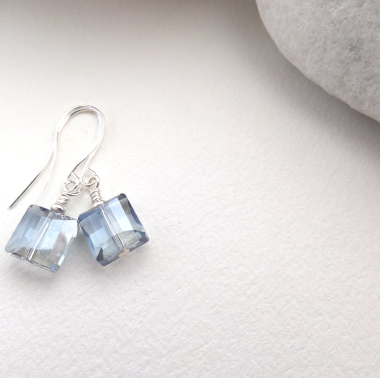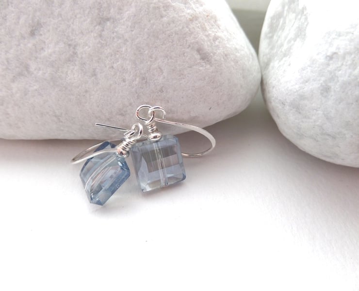 On silver plated elegant hooks, these are wire wrapped, flat cube bead crystals earrings in pale blue. Called Light Cyan.