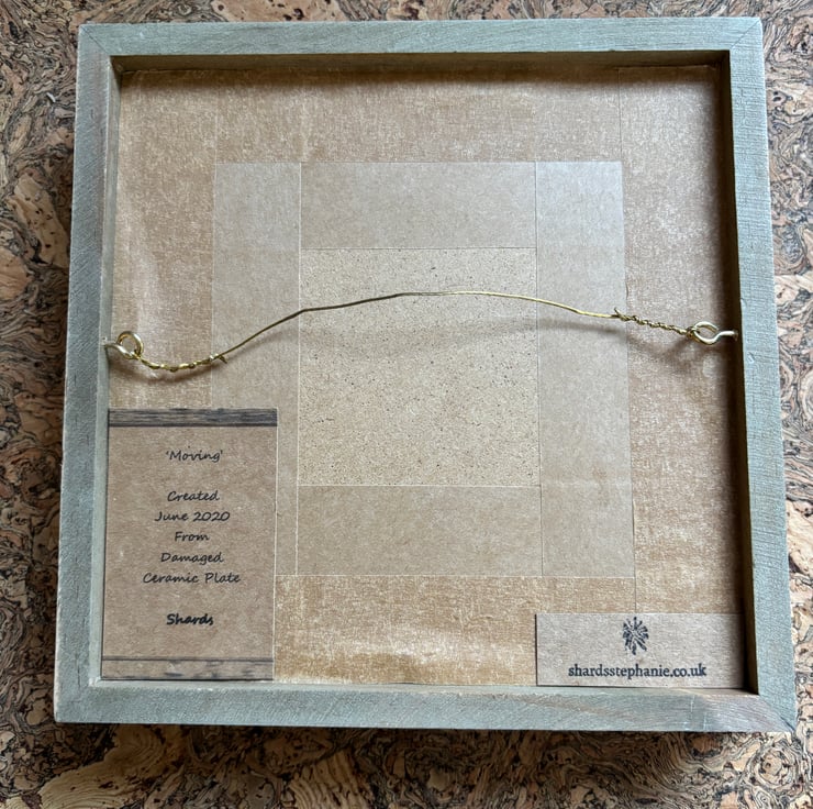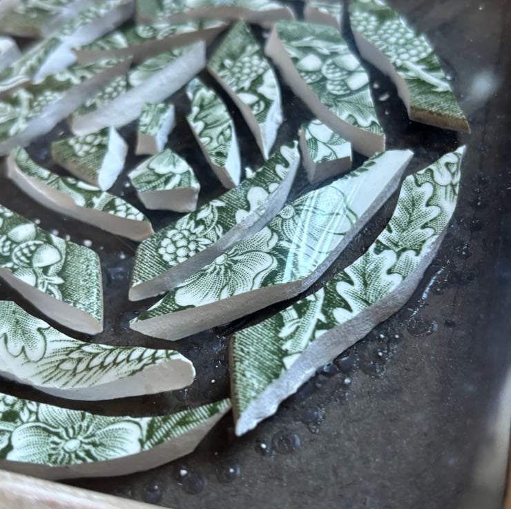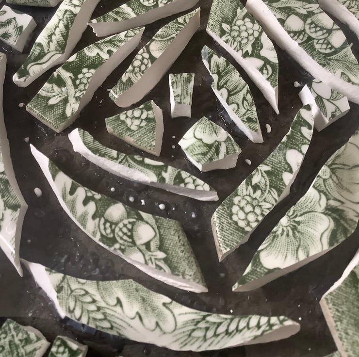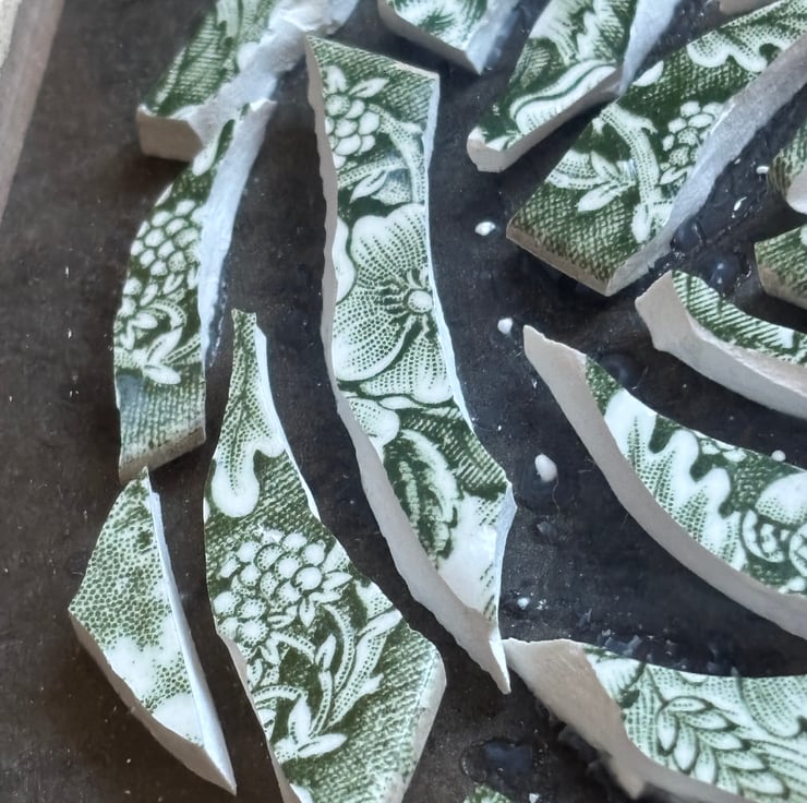 The way the shards are laid out gives a feeling of movement, almost fish swimming around. This large broken green plate destined to be thrown away has now started a new life as ‘Moving’ by Shards.