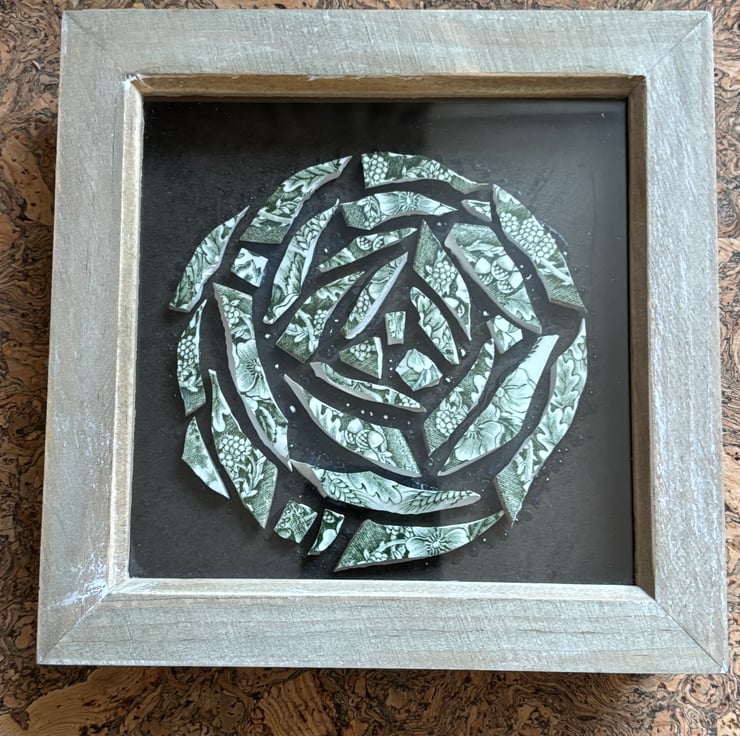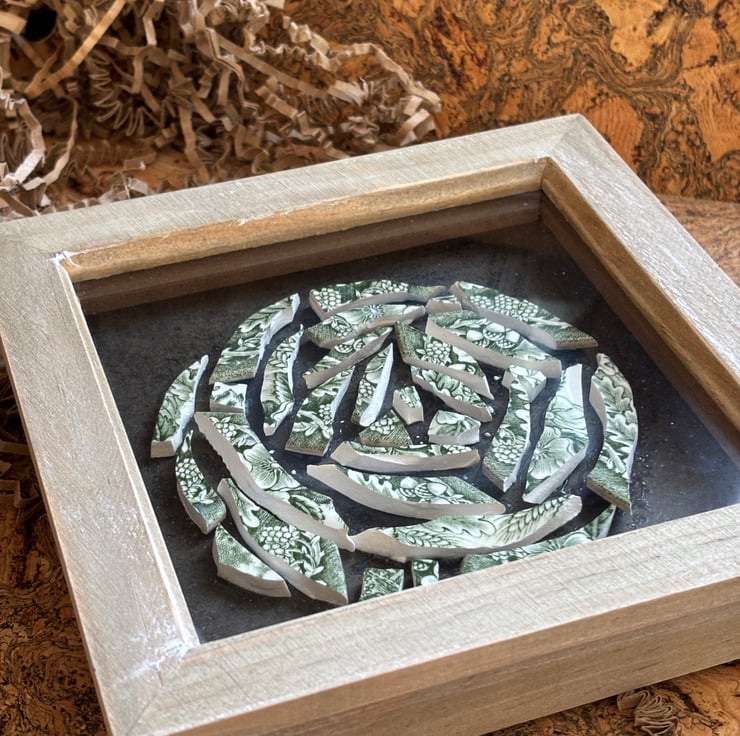 Shards Hand crafted using pre loved and discarded ceramics. Entire process is a creative experience from discovery to final item, nothing planned or preconceived. All materials personally collected from river banks, charity shops, roadside, woods, recycle centres, beaches, wherever dropped, dumped or donated. Everything is hygienically prepared, ceramics cleaned and materials handled following Covid rules. Every piece is individual and catalogued with a capital S for Shards and a numbered referring to order of process. Nothing replicated, however, due to repetitive patterns in ceramics there will be some similarity but only through the ceramic material not in the final piece.