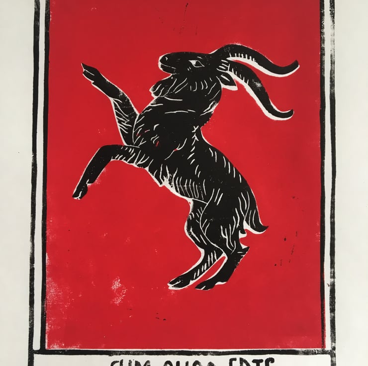 A two colour linocut print of a goat with a quote in Latin. This work is inspired by medieval heraldry and memento mori. The goat is based on a goat illustration seen on coats of arms. The Latin quote, Sum Quod Eris means 'I am what you will become' and is popular on gravestones.