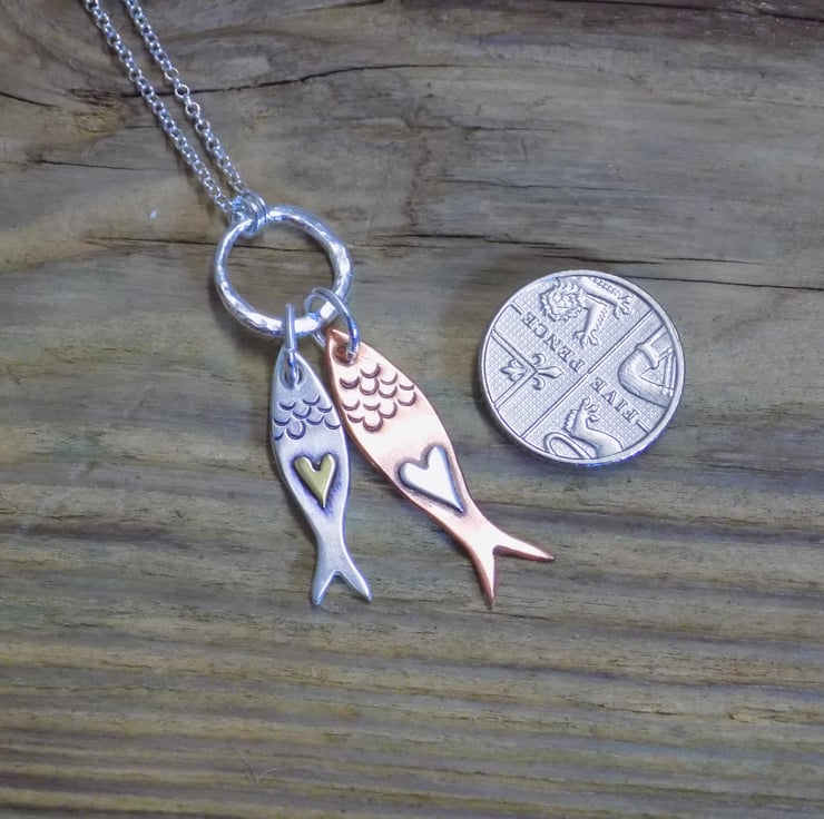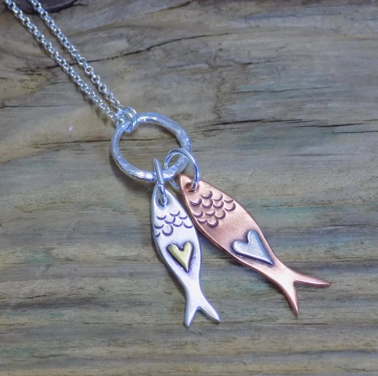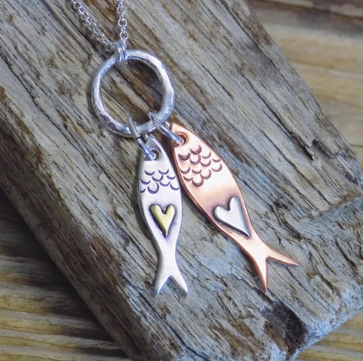 Made from sterling silver and copper sheet. The two little fishes, have tiny little hearts soldered onto them in silver and brass, and have been textured with a punch. They hang from a lovely organic silver circle that is suspended on an 18 " sterling silver belcher chain.