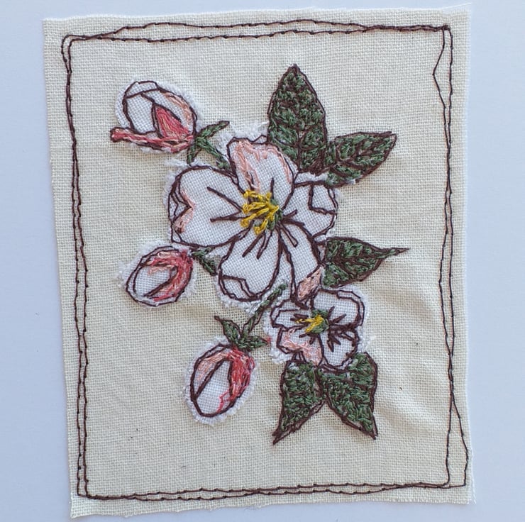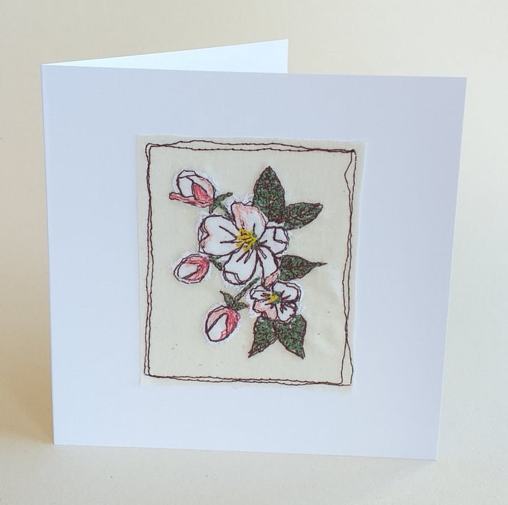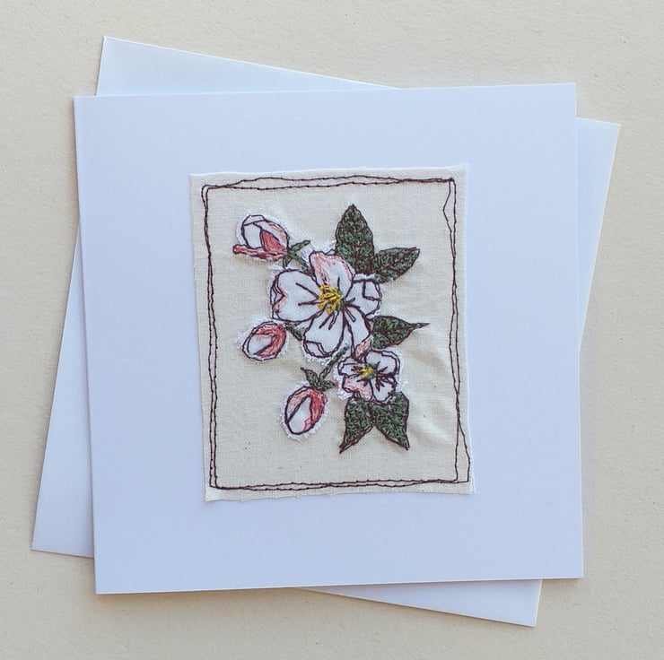 This white card features blossom made using free machine embroidery. The white flowers are individually cut out of fabric then embroidered using different coloured threads to add delicate pink tinges to the blooms.