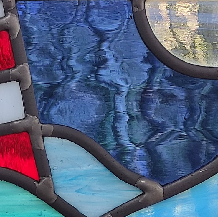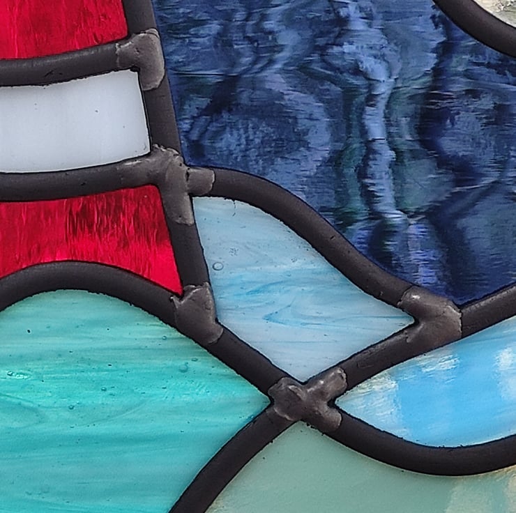 Once cut, the panel is then leaded, soldered and cemented. Hooks have been added for hanging this piece in your window.