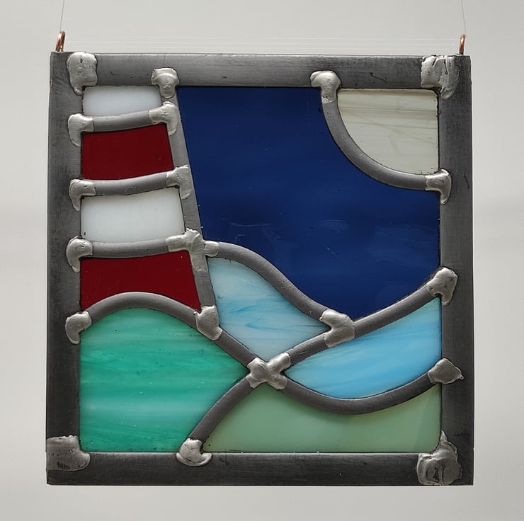 This is a small study playing with a gorgeous deep blue for the sky which has a soft watery ripple. I have made the moon from a wispy grey. The waves are a mixture of blue, jade, sage green and turquoise with soft curving lines. In contrast the lighthouse has strong straight lines with alternating bright white and red stripes.