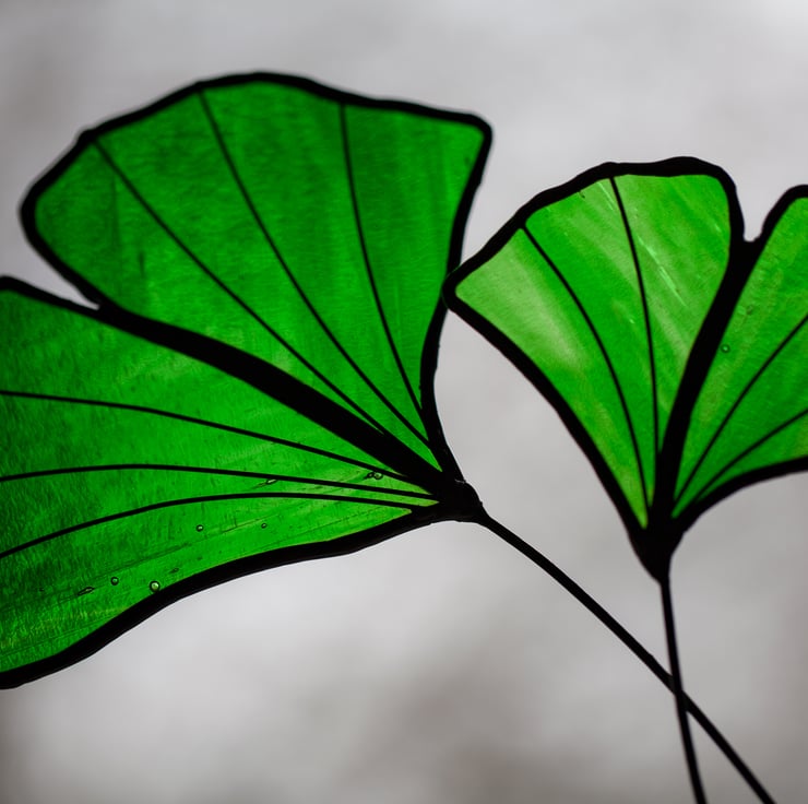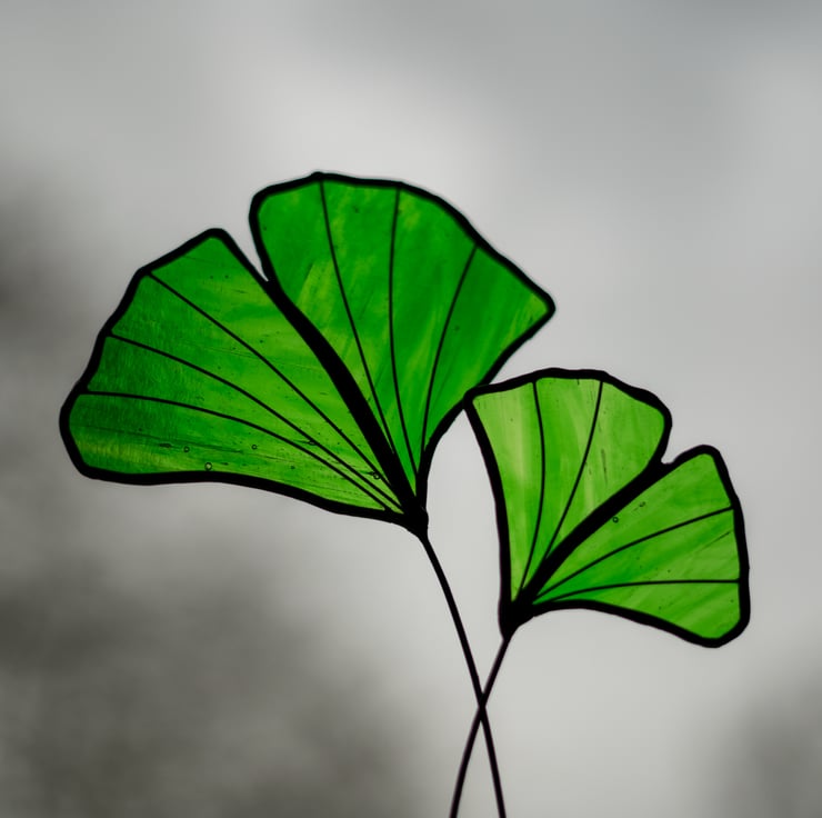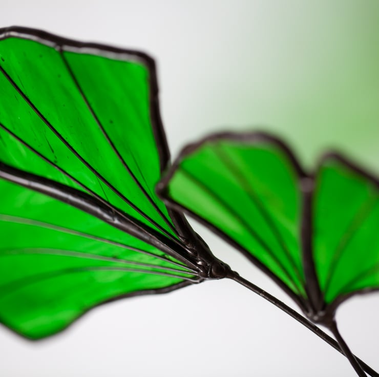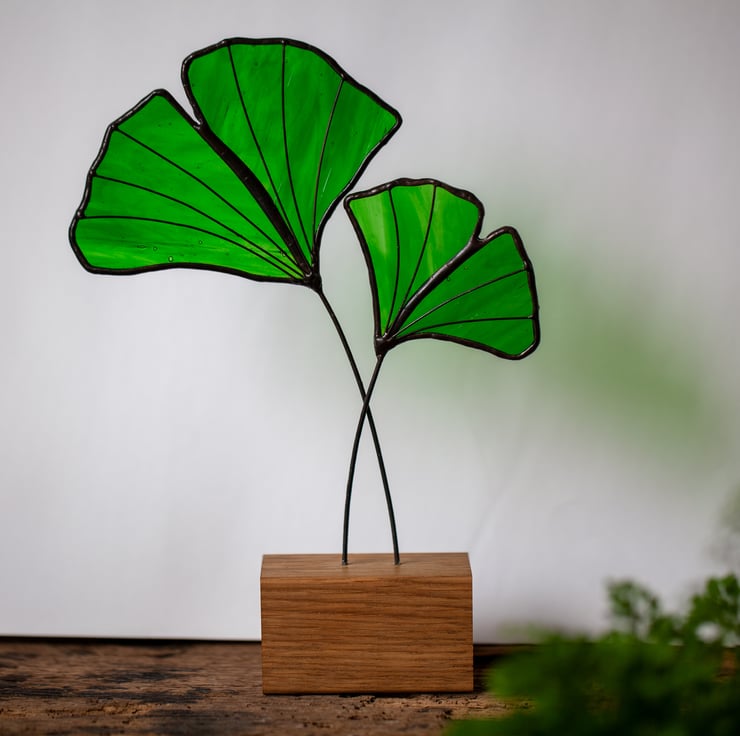 This stained glass ornament has been made from stained glass using the Tiffany technique. The glass has lovely texture. It is finished in black patina, polished and set in a piece of waxed oak. Overall size of the ornament is 22x17x4cm (HxWxD)