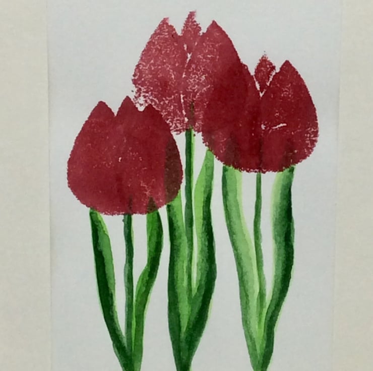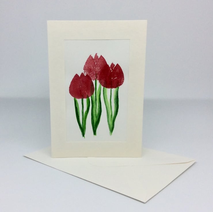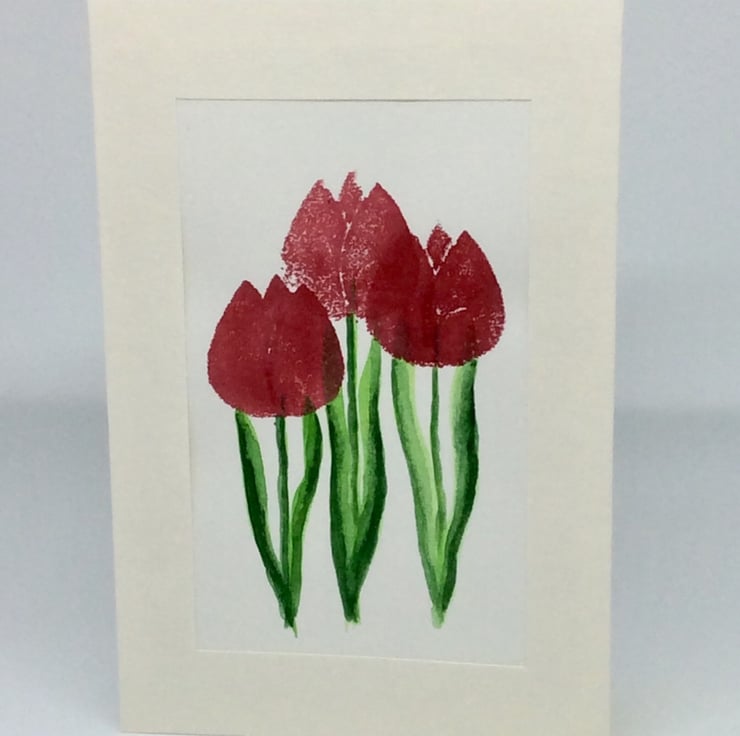 Keepsake, card and present in one. This tulip design is an original; hand printed using handmade stamps with hand painted leaves. The tulips are set in a cream, trifold aperture card (with matching envelope) ready to display and/or frame. The card is left blank for your own message and is 10.4cm x 15.2cm.