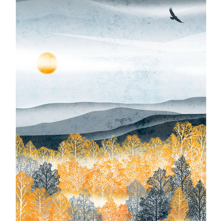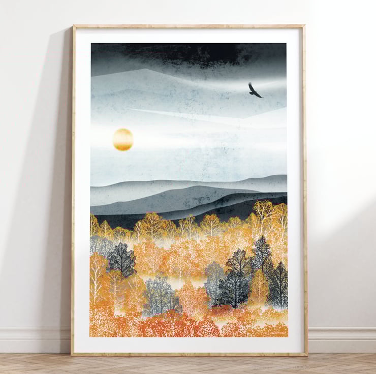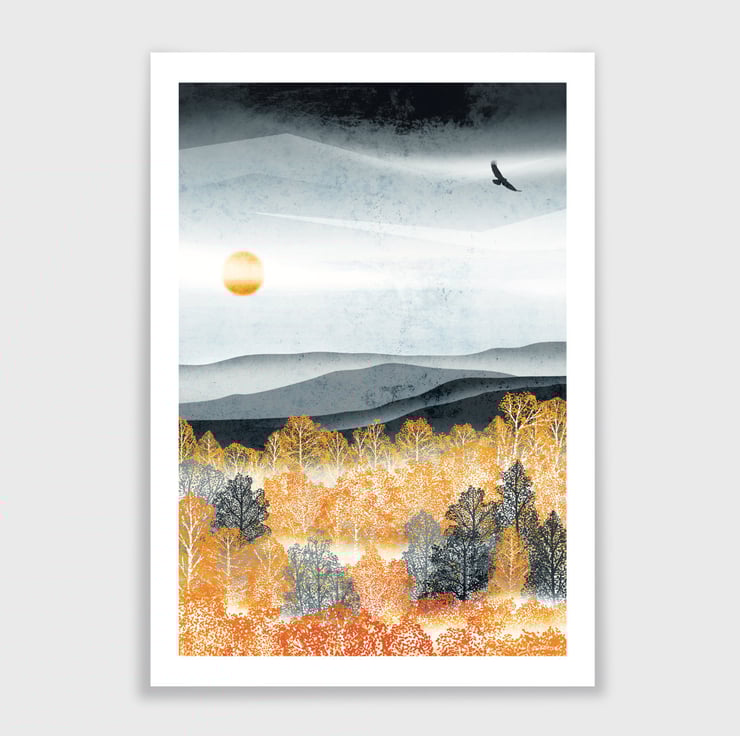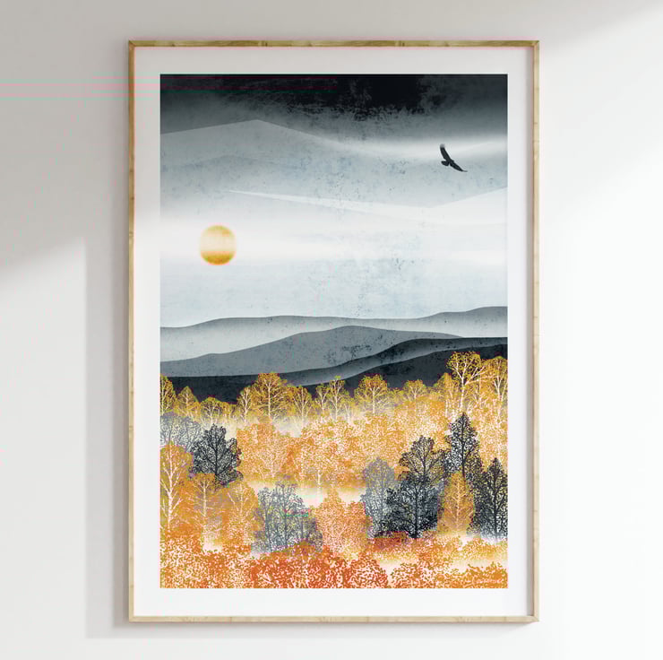 Inspired by the beautiful autumn colours and stunning landscape of the Cairngorms, Scotland this print forms part of my Golden Forest Collection.