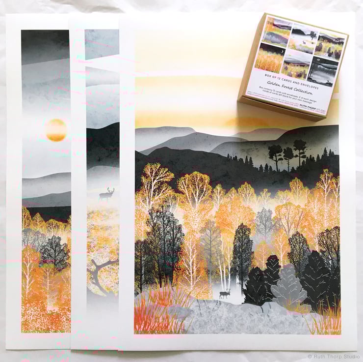 My Golden Forest Collection started life as an editorial commission for Ernest Journal for which I illustrated an article written by Nick Hunt about the mythical history of the wild Cairngorm reindeer herd. I was so inspired by the landscape and colours of the Scottish Highlands that I later decided to add an extra four illustrations which now complete the collection and are all available as prints and cards in my shop.