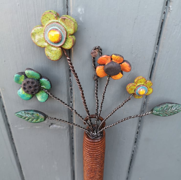 A bunch of Pottery Flowers and foliage arranged in an upcycled spring!