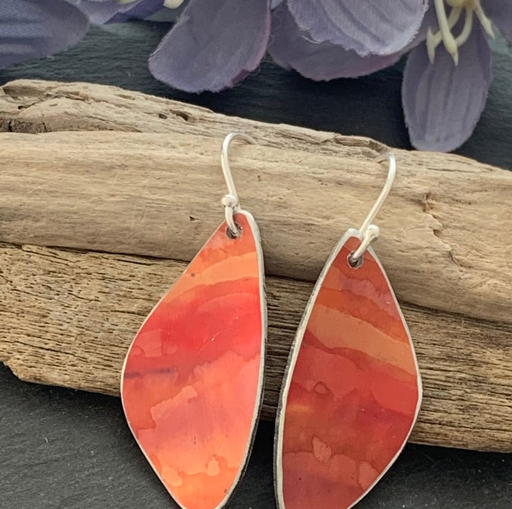 These earrings are made with a hand dyed/printed aluminium. The wing shape drop has been hand pierced/cut and slightly shaped to give it a gentle curve. These have been dyed in a lovely combination of orange shades to create a stripy effect.