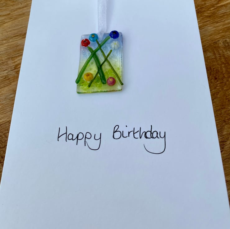 Multi-coloured flowers and long green stems have been fused onto this little hanging keepsake measuring 3cm by 4cm which can be removed from the card and hung in the light.