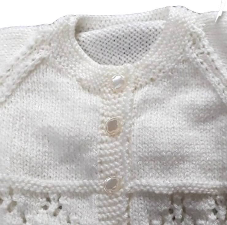 The baby cardigan boasts charming raglan sleeves and a delightful diamond eyelet pattern gracing the lower section of the body and sleeves. The upper part showcases delicate stocking stitch, culminating in a round neckline that exudes sophistication. Fastening with dainty cream buttons down the baby's chest, this cardigan embodies both elegance and practicality.
