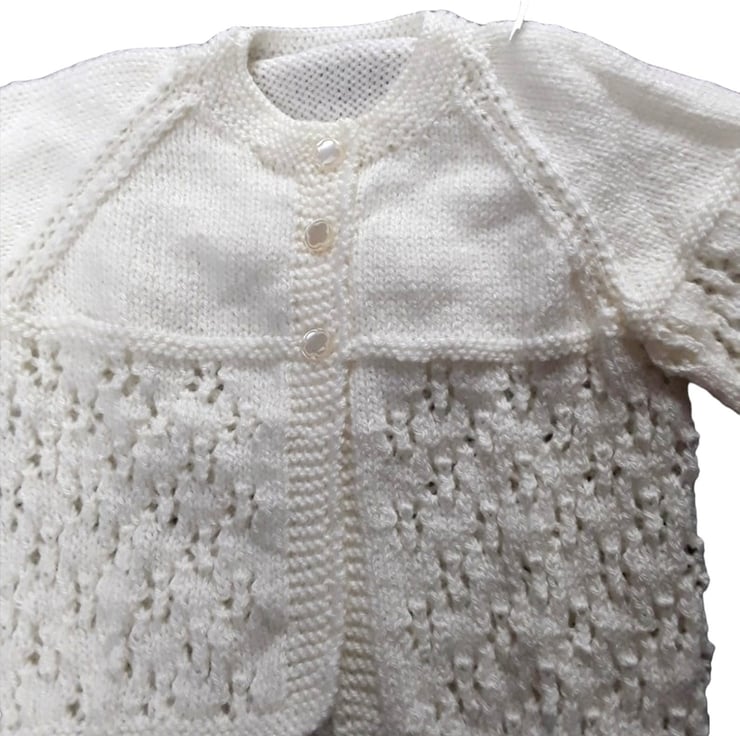 This delightful cardigan comes complete with matching booties and mittens, all featuring the same enchanting diamond pattern as the cardigan. They fasten securely with cream double satin ribbon, adding a lovely finishing touch to the ensemble.