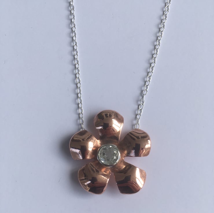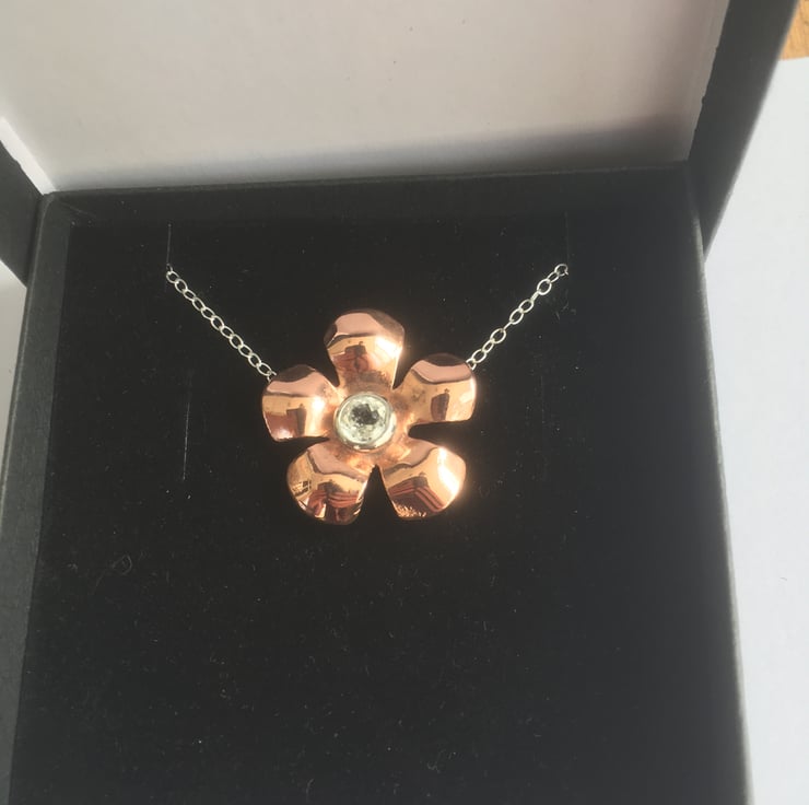 It hangs beautifully and is a pleasure to wear . The copper blossom has been formed by hand using traditional methods. All finishings and chain are sterling silver.