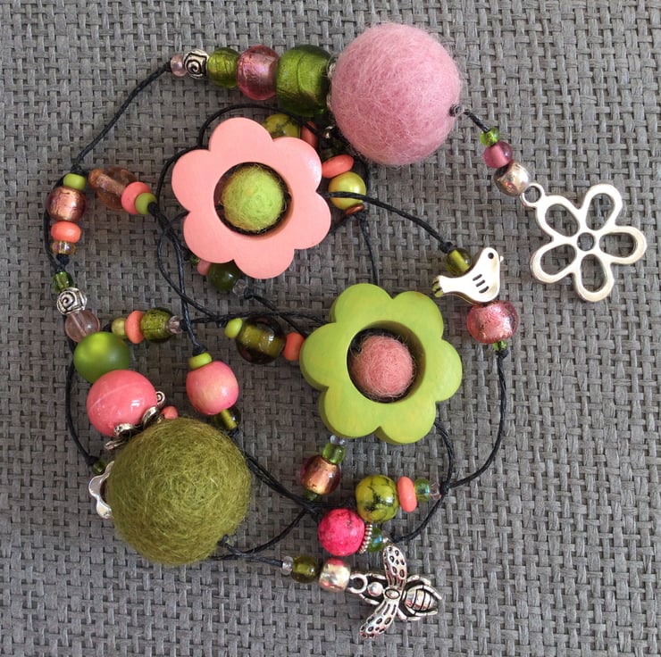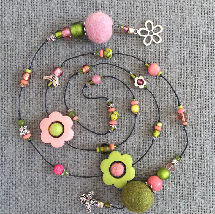 Lariat necklace featuring a glorious mixture of beads in soft shades of green and pink. The beads include large painted wood flowers, felt balls, glass and wooden beads, mixed in with antique silver tone beads and charms, including flowers, a butterfly, a bee and a bird, all strung on a waxed linen thread.