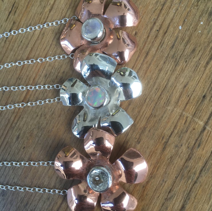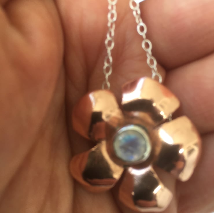 It hangs beautifully and is a pleasure to wear. The copper blossom has been formed by hand using traditional methods. All finishings and chain are Sterling silver. The pendant measures approx 45cm long in all.