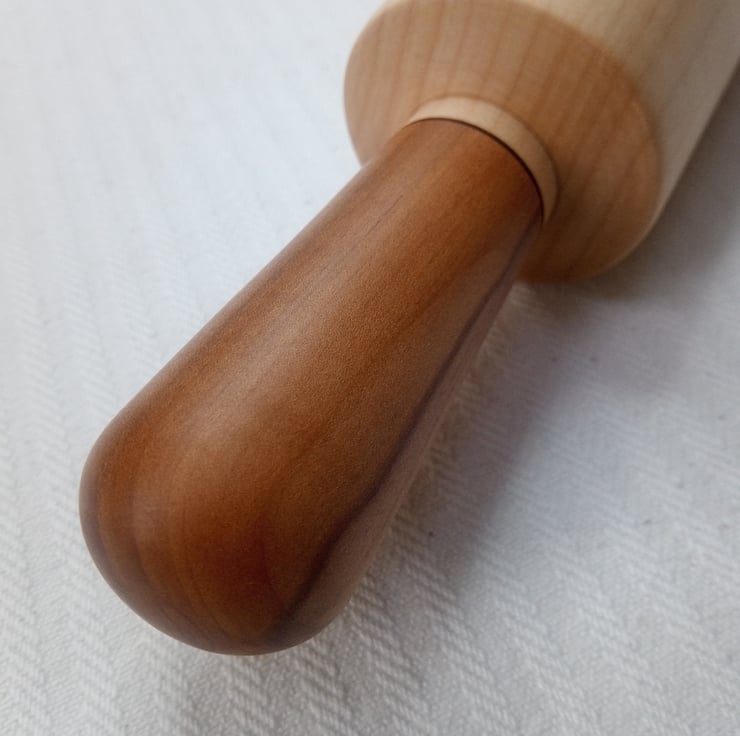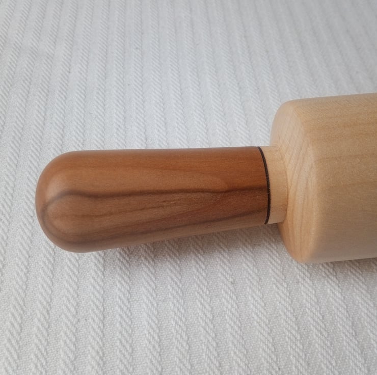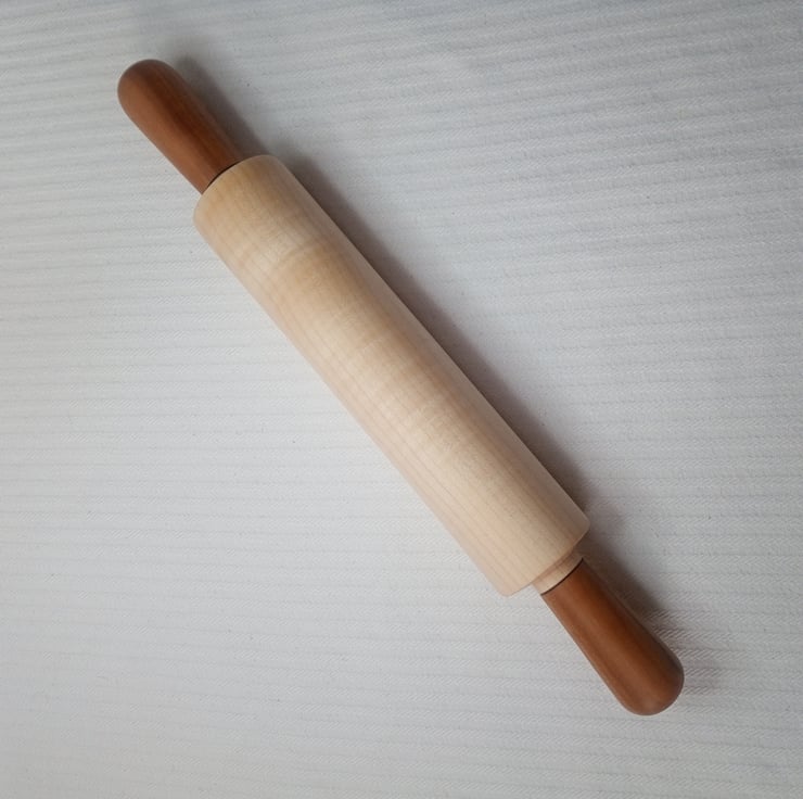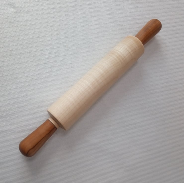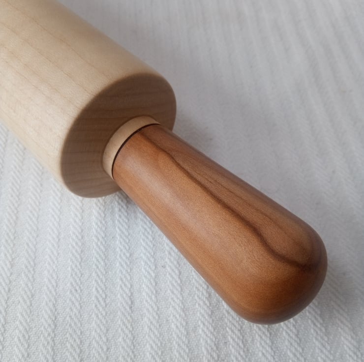 A Rolling Pin to bring perfection to all your pastry making great for rolling biscuits and icing. This one has some super Apple wood handles with lovey golden brown stripes running through them and a fantastic stripey Ripple Sycamore roller that shimmers and glows with lovely markings and undulations. The Apple came from the old orchard in the Abbey Gardens here in Waltham Abbey and the Sycamore is from Yorkshire. It feels super smooth all over and I've put a delicate black friction burnt detail at the bottom of the handles to accentuate the colours. This is a great addition to the kitchen for all cooks, it's always good to enjoy making pies, tarts and biscuits with beautiful utensils. Gives a good sense of satisfaction and the brilliant thing about wooden Rolling Pins is that they roll the dough rather than stretching it so it doesn't shrink - we don't want shrunken pastry after all that effort!