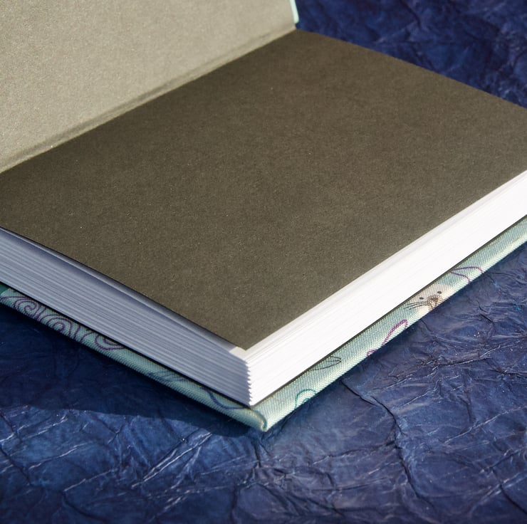 - Quarter binding with decorative fabric cover and coordinating bookcloth spine