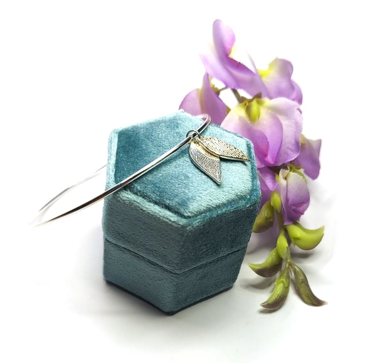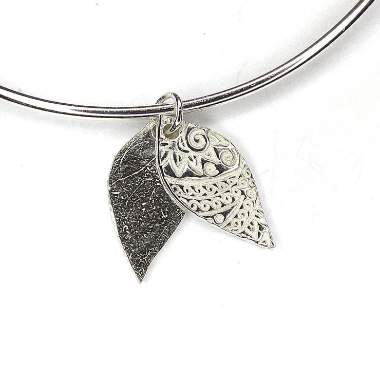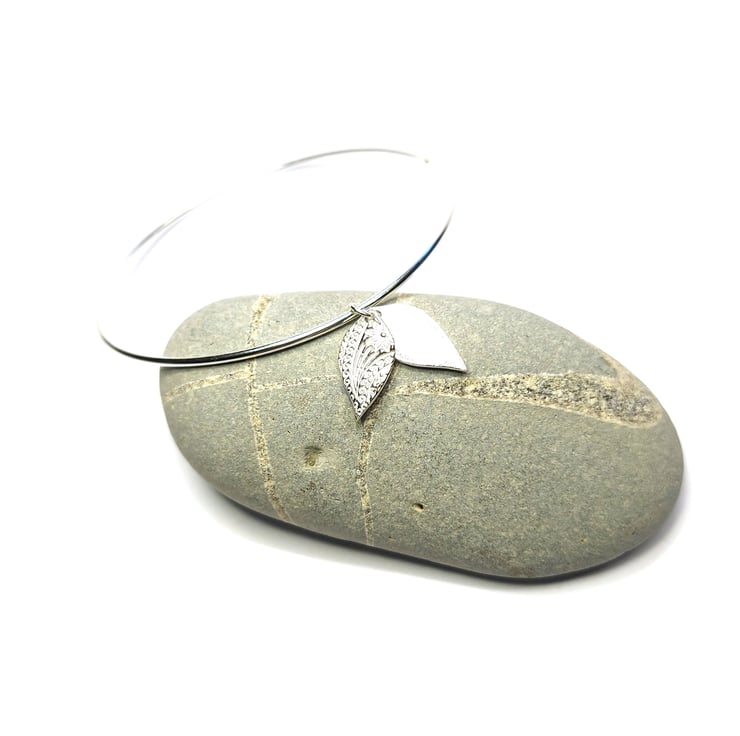Who doesn't love a bangle? This solid silver bangle features two silver patterned leaf shaped charms. Each leaf has the beautiful Boho pattern adding extra detail to your wrist.