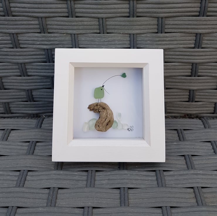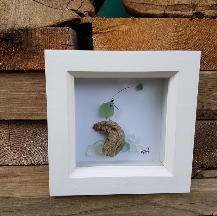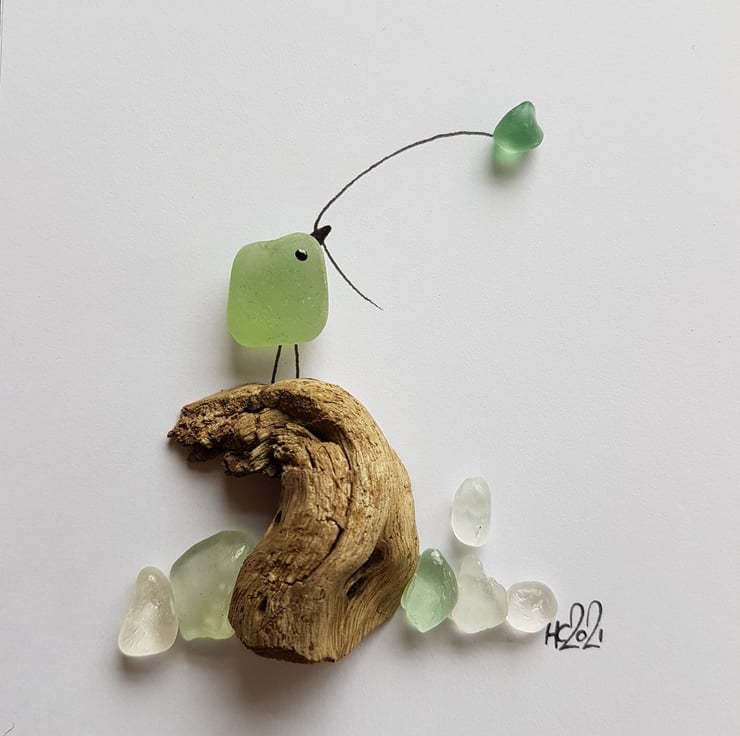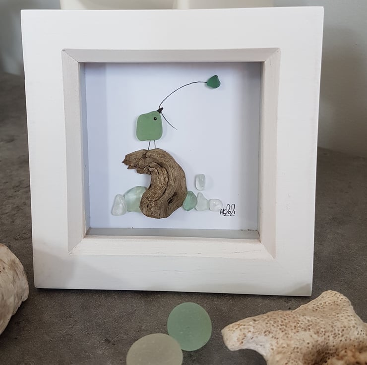 A cute little sea glass picture of a bird holding a heart shaped balloon. Made from beautiful natural coloured sea glass and driftwood collected from Seaham Beach in the North East of England.