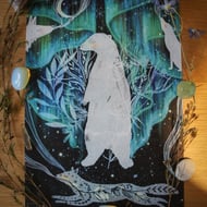 A linocut print depicting a hare with bluebells, moon and stars.