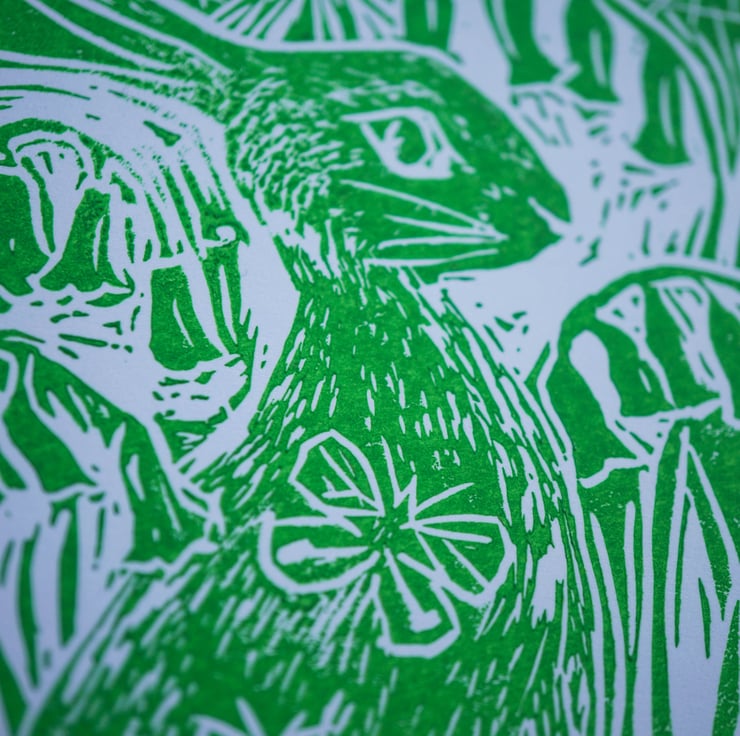 Spring Green Hare With Bluebells - Linocut Print