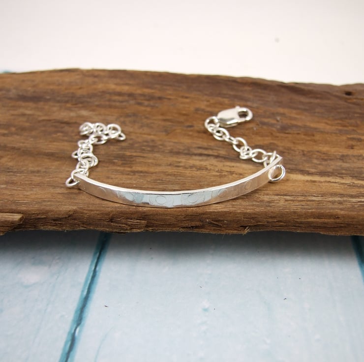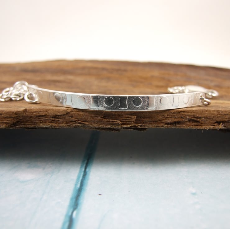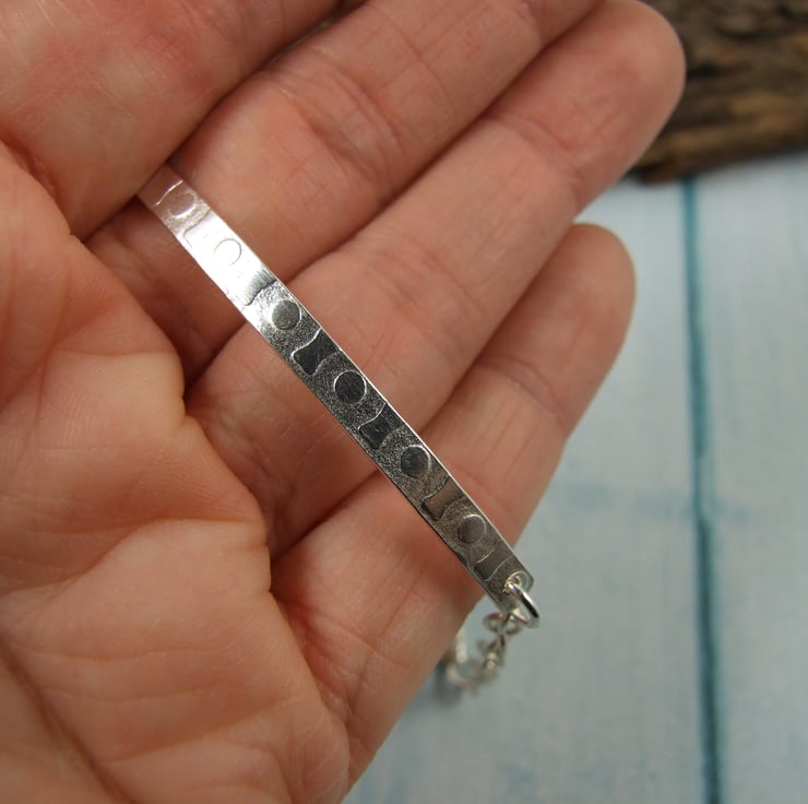 The bracelet centre piece is made from 1mm thick solid sterling silver which I have hand cut, shaped, sanded drilled and then embossed using a rolling mill to create the line and dot pattern which has been cut from card. Fitted to sterling silver chain with lobster clasp closure.