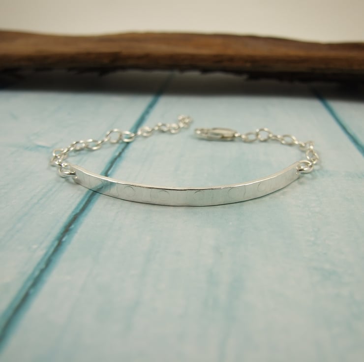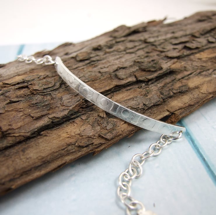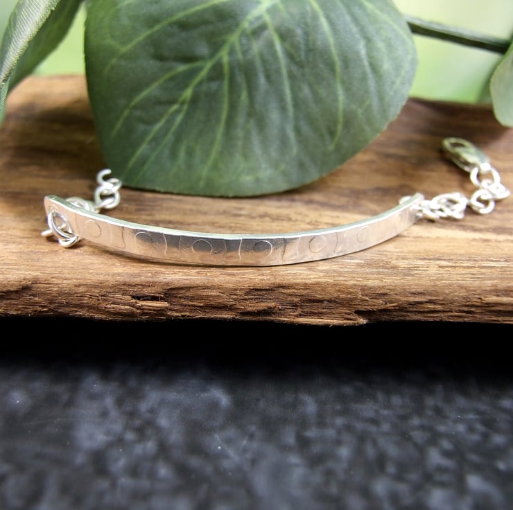 Hand forged Sterling Silver Bracelet. Slim Bar Embossed with a with spot pattern.