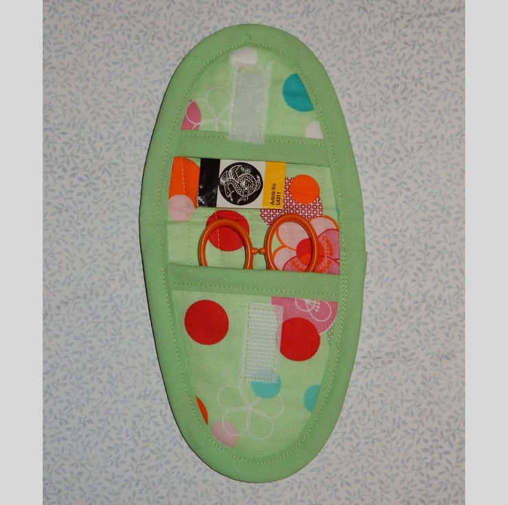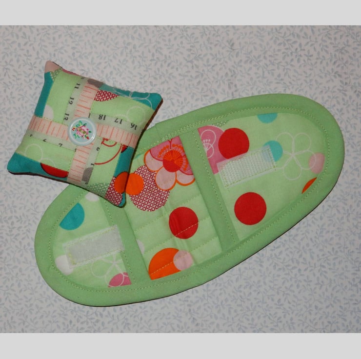 This would make a great gift for quilters or embroiderers, this scissors case measures approximately 5 x 4 inches when closed and will fit most embroidery scissors. It fastens with Velcro and has a decorative button. It is made from fabric featuring tape measures and a toning print, with green binding. When open it has a space for scissors, and a small compartment for a pack of needles, thread etc. There is a matching mini pincushion, which also has a matching button.