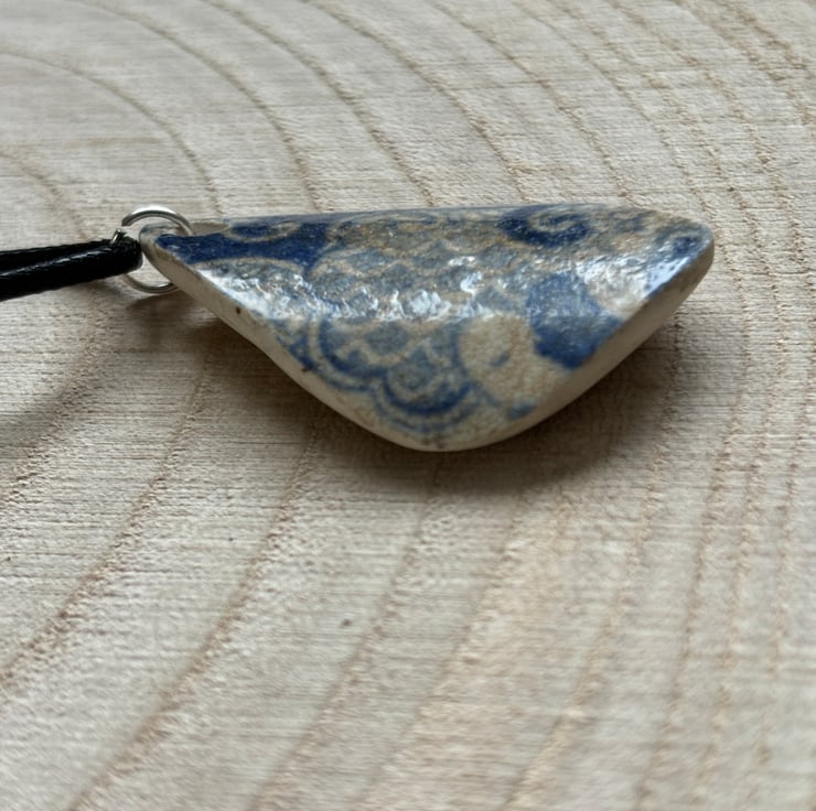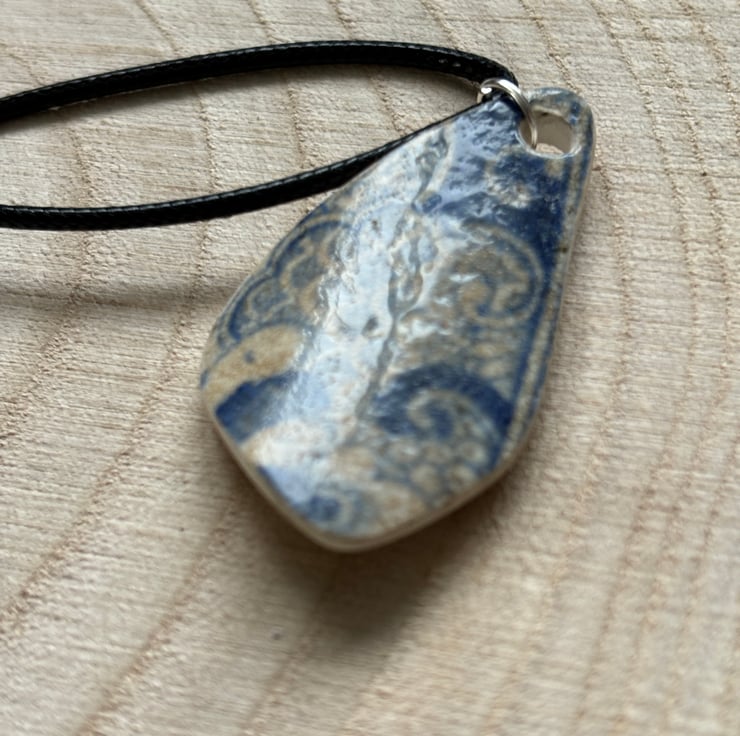 This is one of my favourite pieces of mudlark ceramic, stained, travelled and a distinctive shape. I love the way the sea can smooth anything, with time and movemen, with this in mind I have smooth the sides and back using a very fine hand file. Although the front pattern was intact, it was very grubby and the glaze had worn off. I hand buffed the front over quite a lot of days and found the shine restoring. The shape is difficult to describe, the back is flat with a tiny bit of glaze left. The front is curved, with varying different sides.