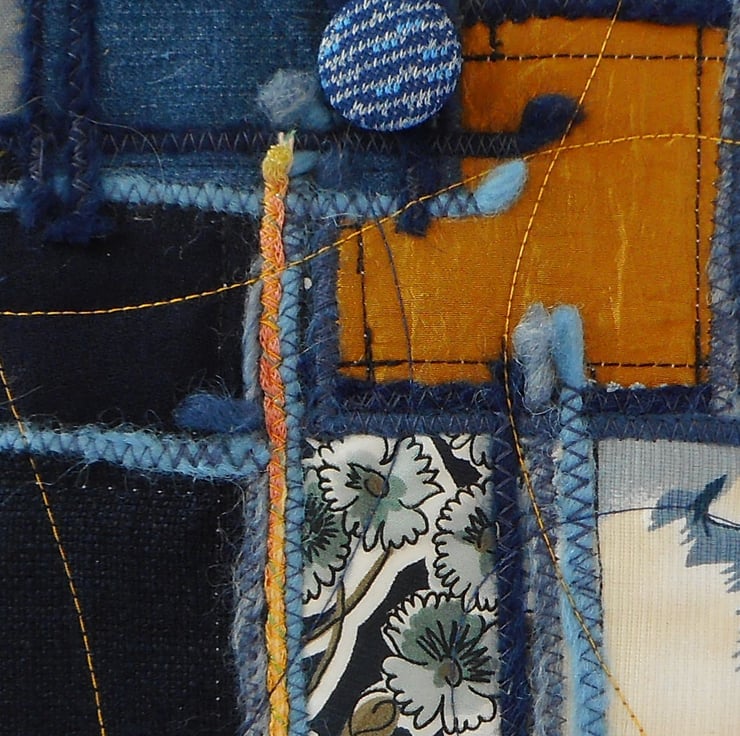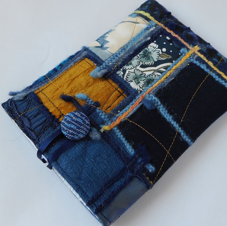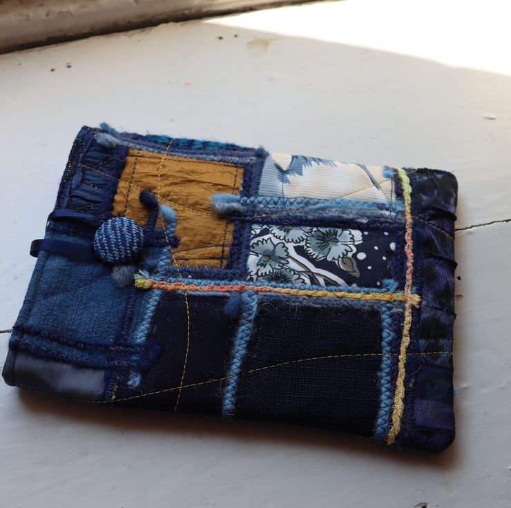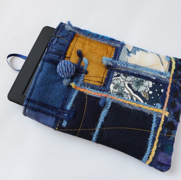 Machine embroidered textile case for a kindle or similarly sized tablet, made from recycled fabrics and various yarns and threads. Blues and golden yellow have been combined, because I liked them together!