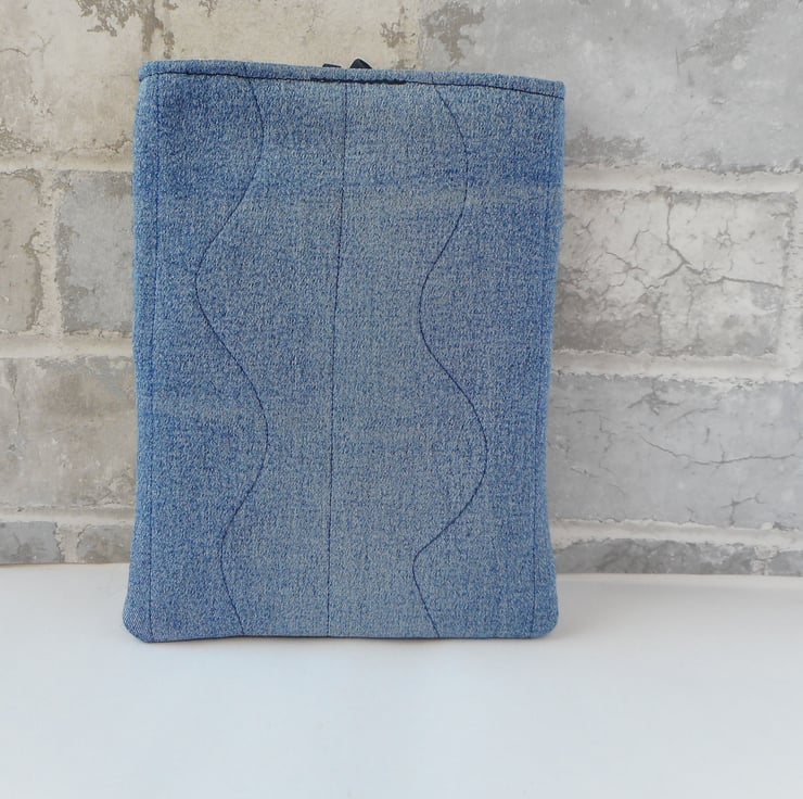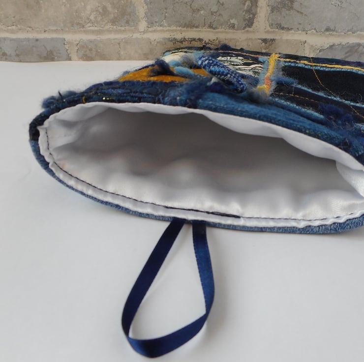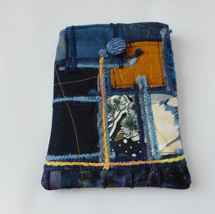 The case front is pieced together from multiple fabrics, with machine embroidery and yarny tufts for texture. The back is made from recycled denim jeans, with a vintage button and ribbon loop for the fastening. Lined in thick white satin. This case is lightly padded and will provide protection from scratches. It's not drop-proof however.