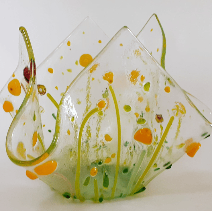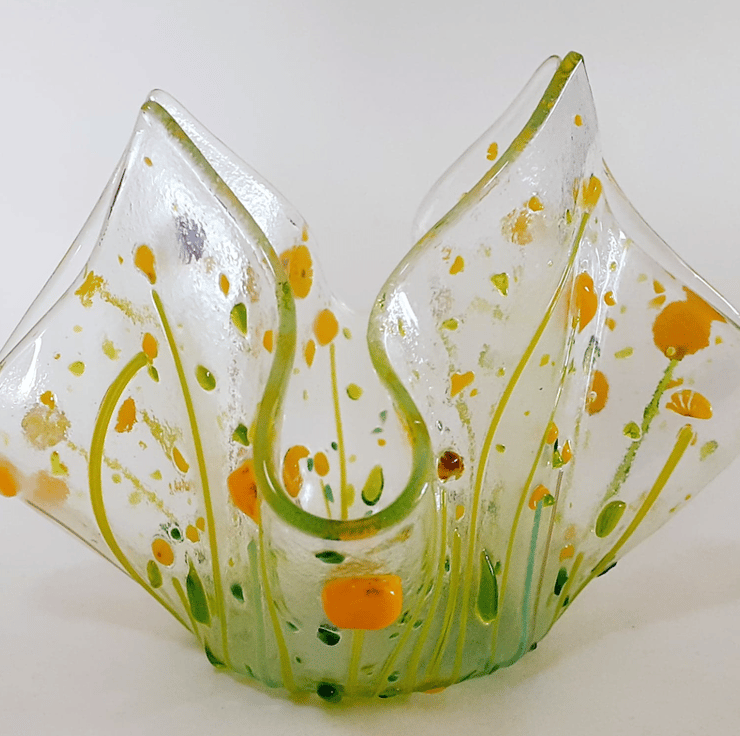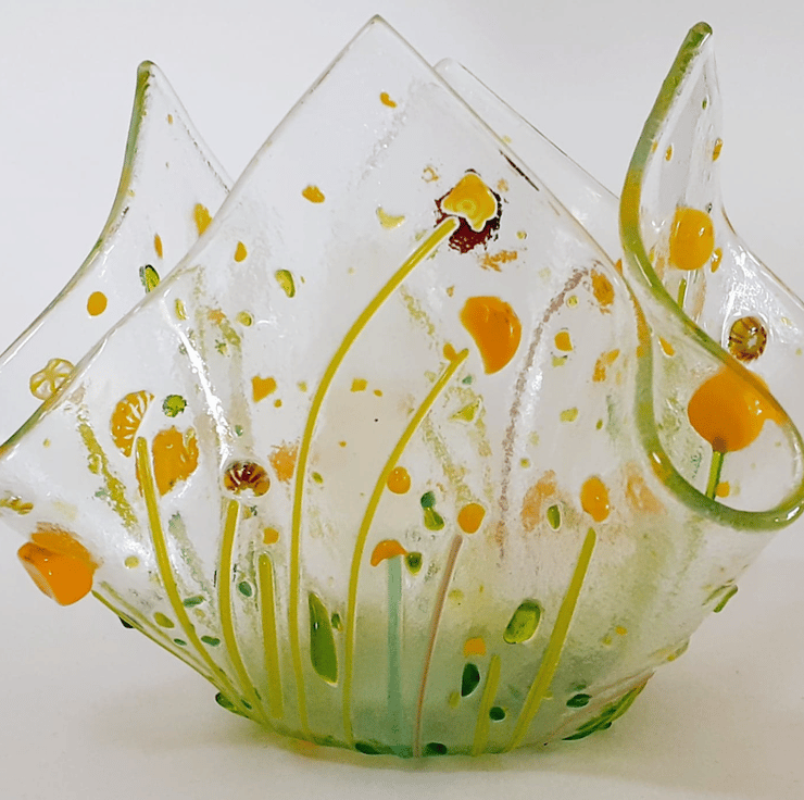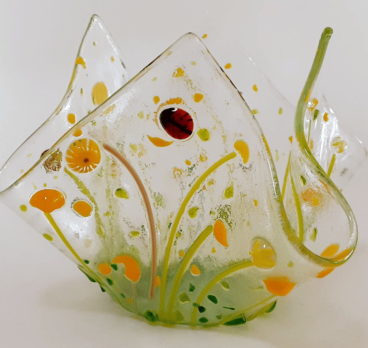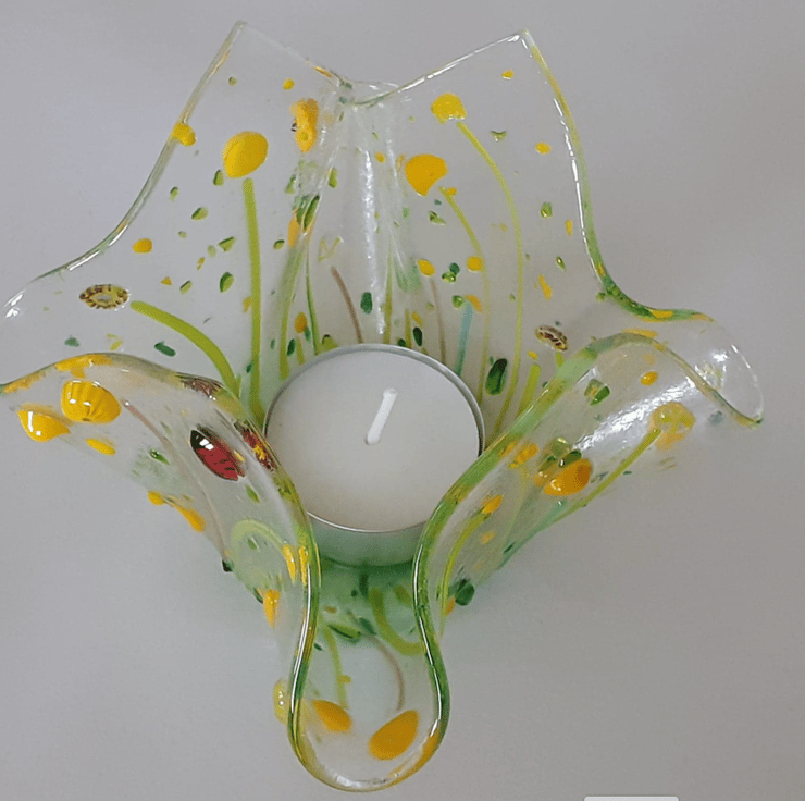 Delicate fused glass tea light or candle holder, decorated with textured glass stems and flowers. The fresh yellows and greens are reminiscent of a spring day. A tiny glass ladybird sits in one corner and the base is dusted with green glass powder.