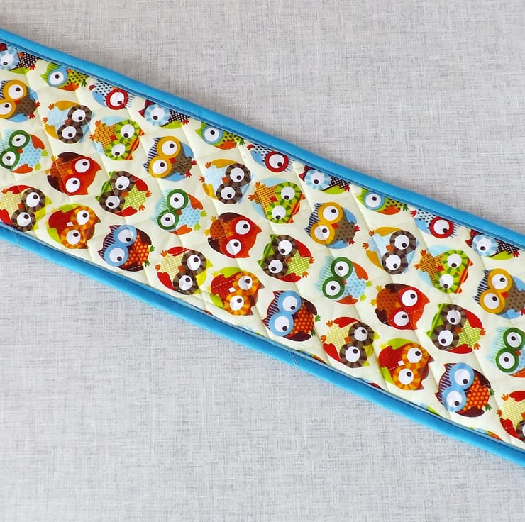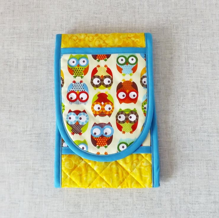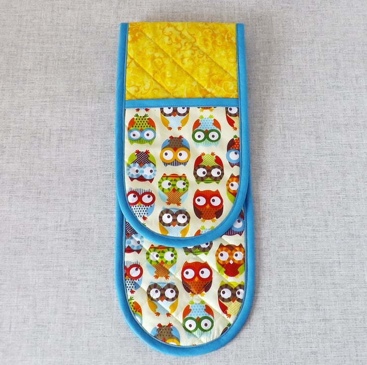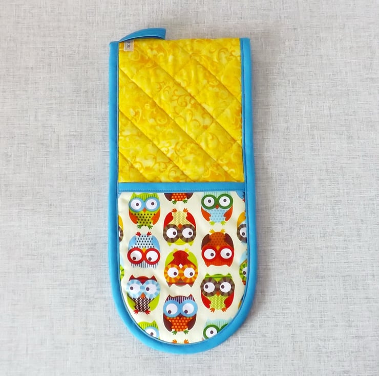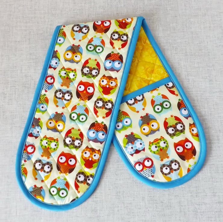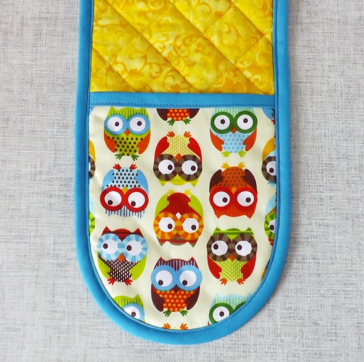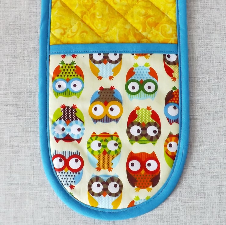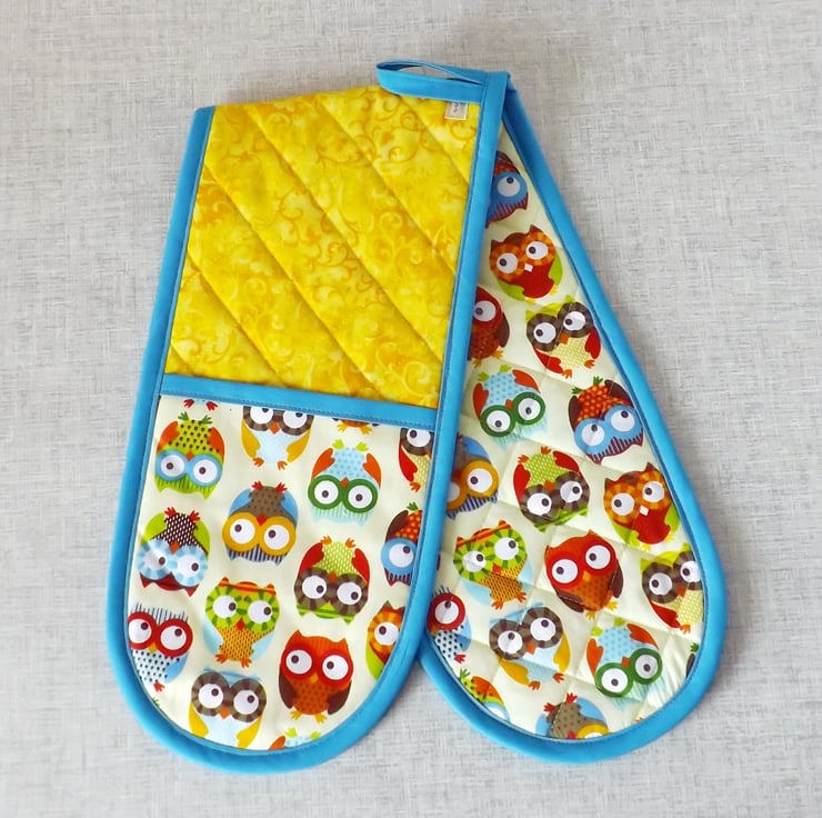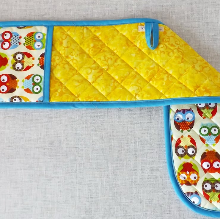 These oven gloves have been made using a lovely owl cotton fabric with a contrast yellow cotton fabric. The owls are in lots of colours on a creamy yellow coloured background.There is a layer of insulating wadding, and a layer of cotton wadding inside, and the main section of the gloves have then been quilted.