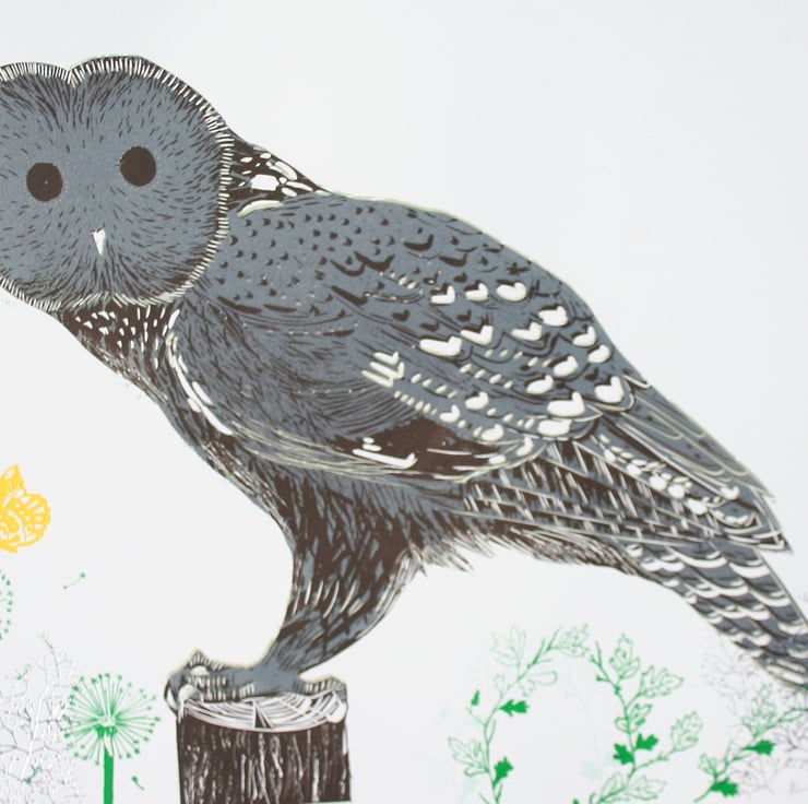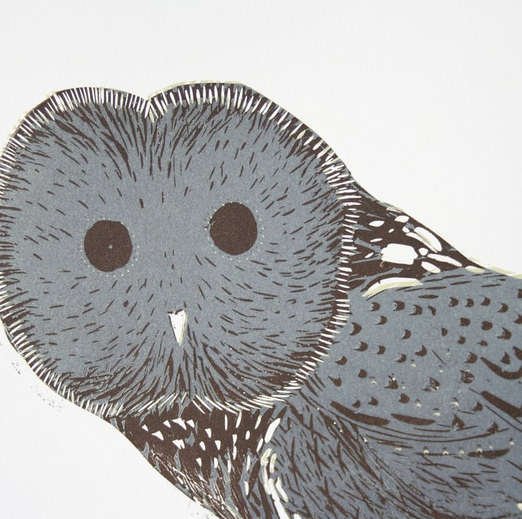 2 colour reduction lino cut of a lovely owl