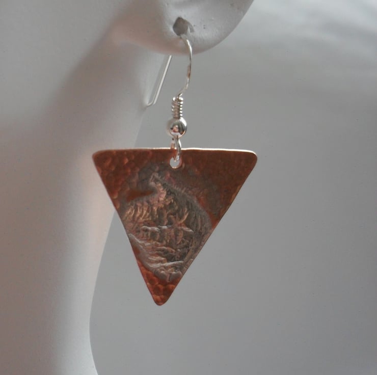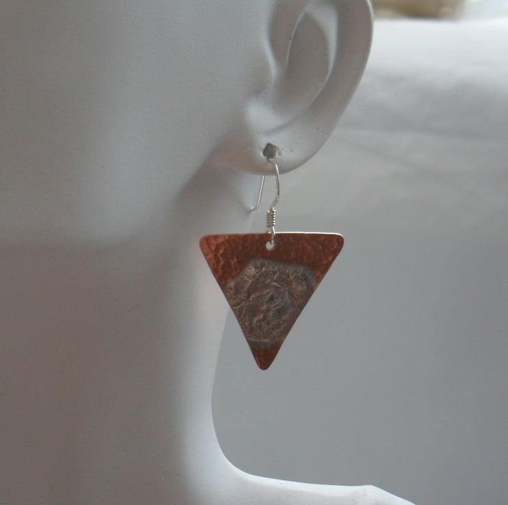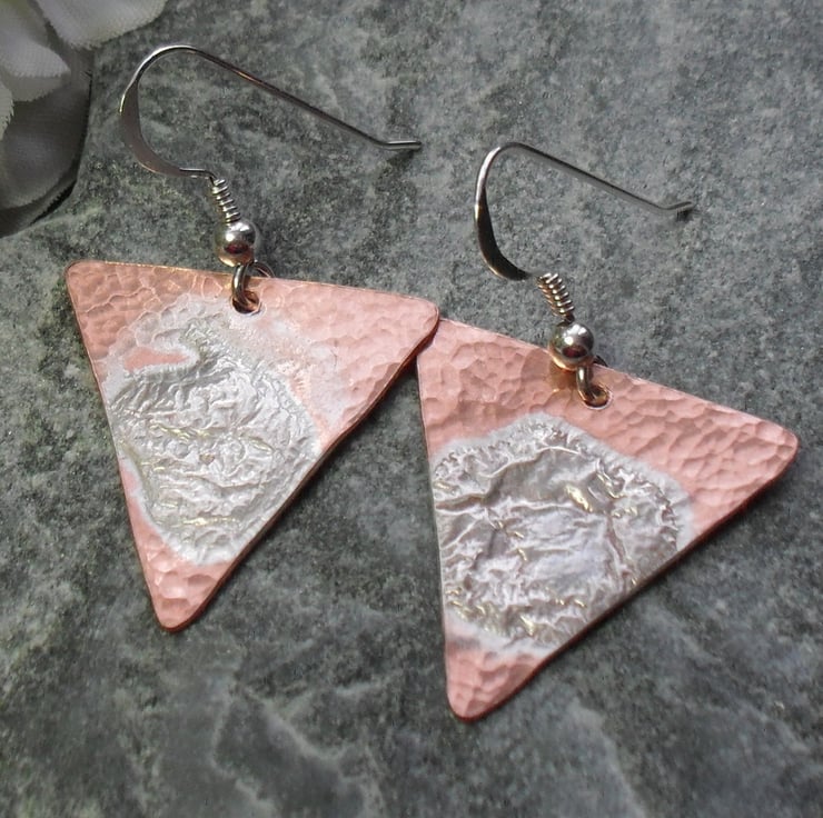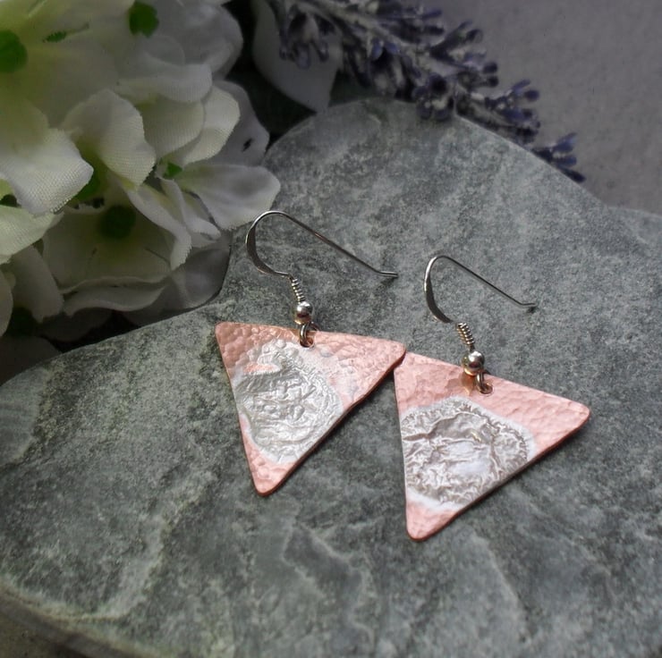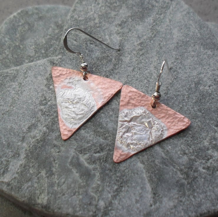 These Earrings have been made with triangle shapes of copper which have sterling silver melted on the top and lightly hammered to give texture. The copper and sterling silver shapes have then been attached to sterling silver ear wires.