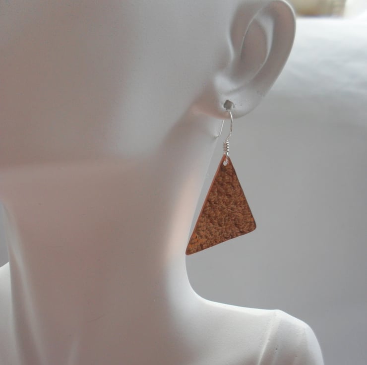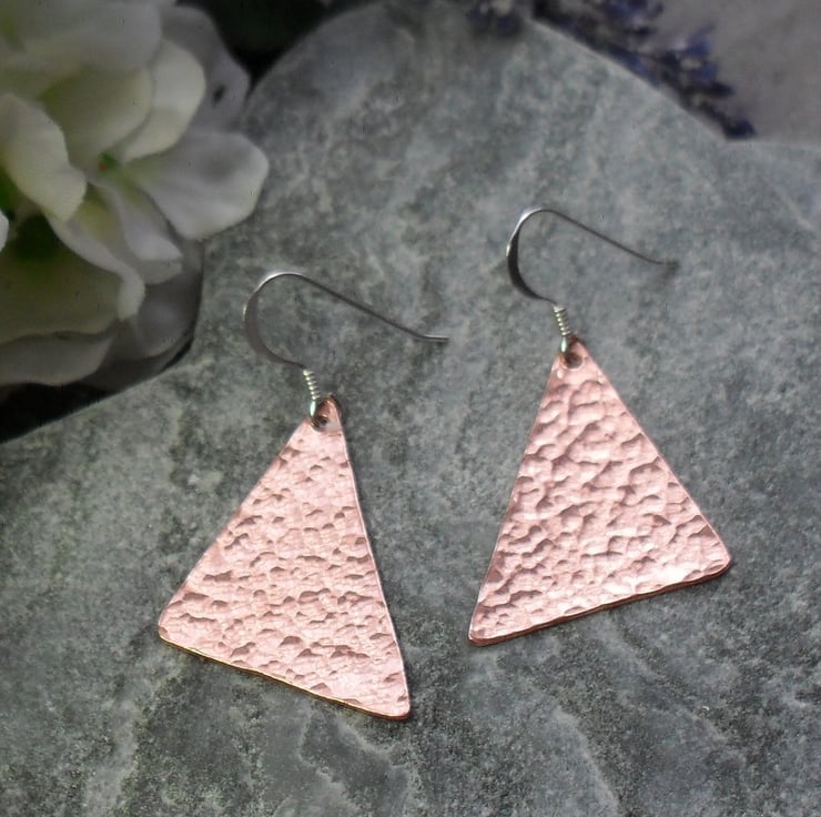 These Earrings have been cut from a sheet of copper hammered to give texture and a lovely shine. They are then attached to sterling silver ear wires